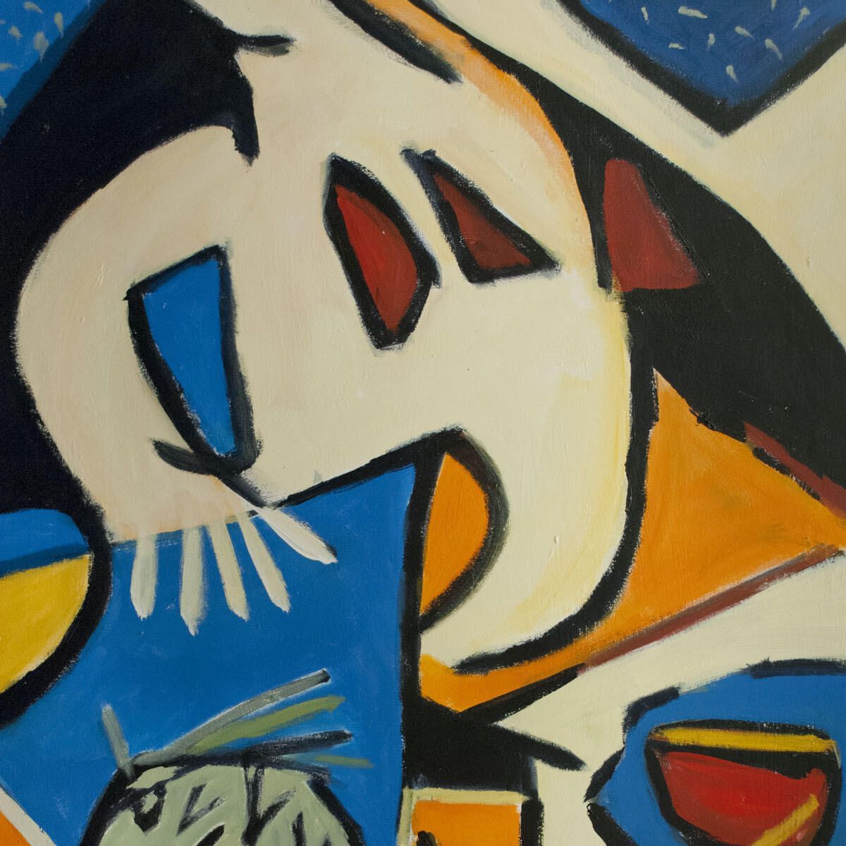 Abrasions, smudges throughout the border. Abrasions, paint transfer in image. Seated figure, fish. Munroe street series.Location
