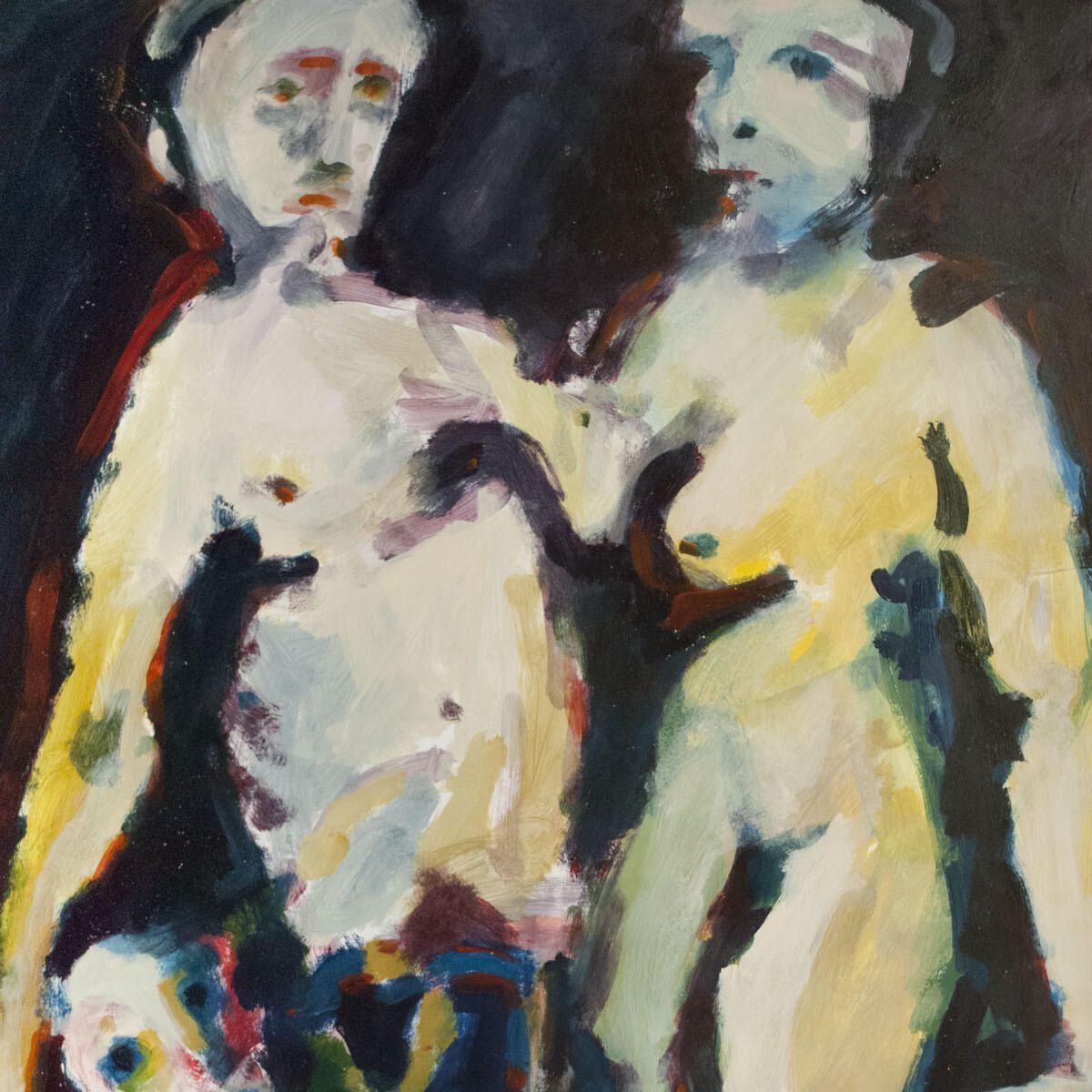 Bleed image, multiple pinholes in corners. Paper adhered, paint transfer, some abrading of image surface. Three nude figures. Montserrat.Location