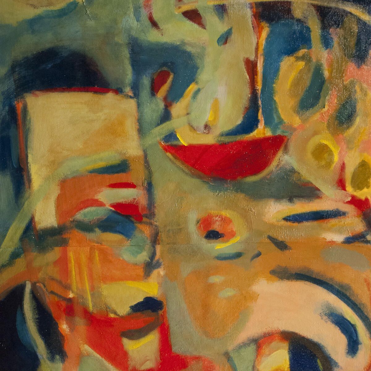 Bleed image. Tears and pinholes in corners. White paint transferred from another image in upper-right quadrant. Abstracted figure reclining?Location