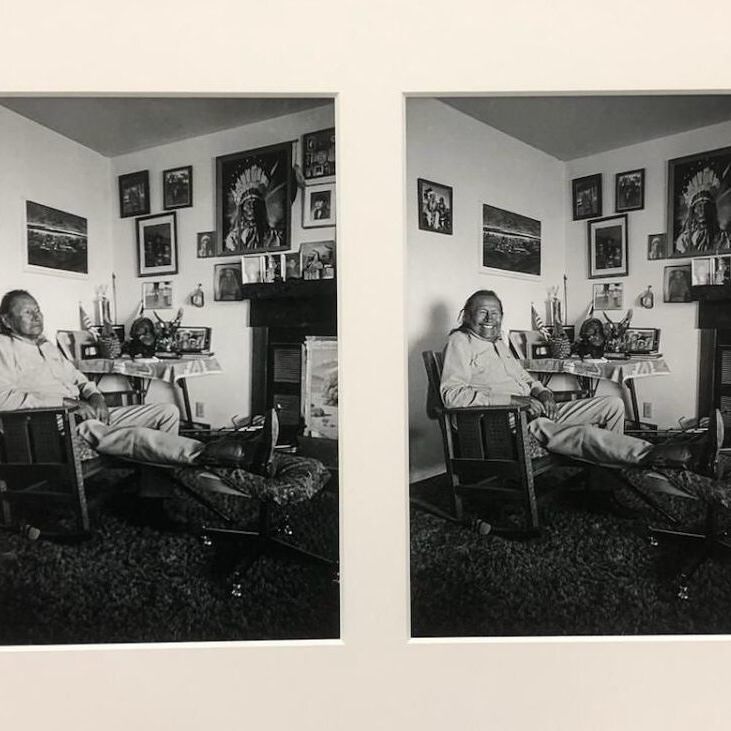Two side-by-side photos of Austin Two-Moons one in which he is stoic and the other he is laughing. Black and white, human, man, room, chair, pictures, indigenousPhotograph Details