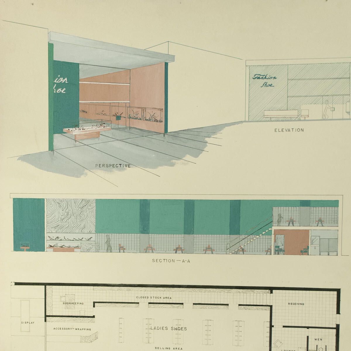 Elevation and floor plans for proposed shoe store. Foxing, wear in borders.Artwork Details