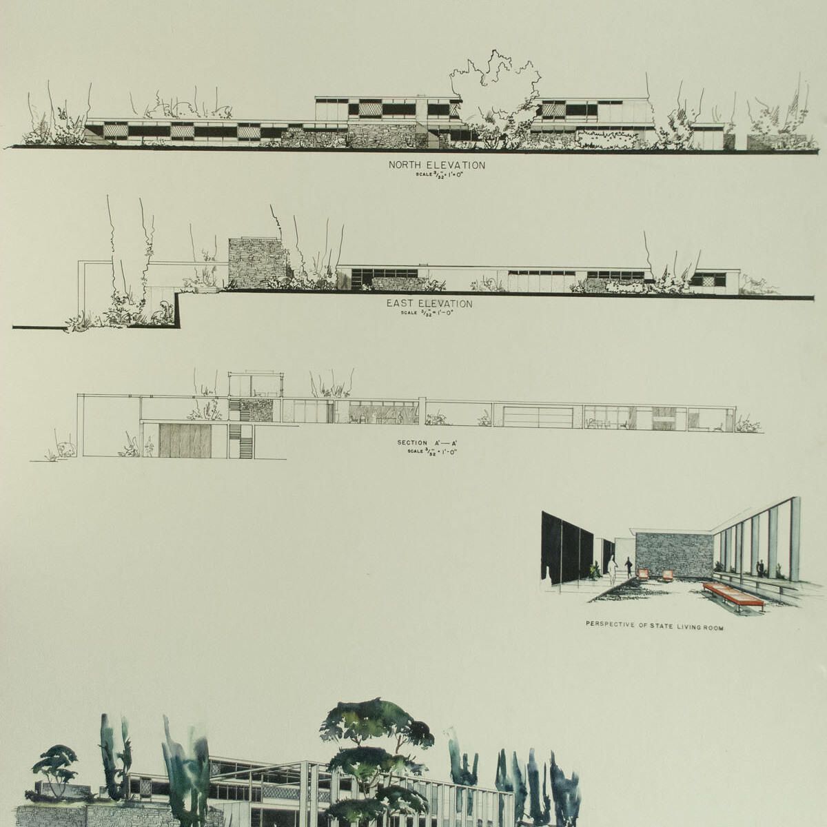 3rd floor plan, North and East elevations. Smudges throughout image, foxing and wear in borders.Artwork Details