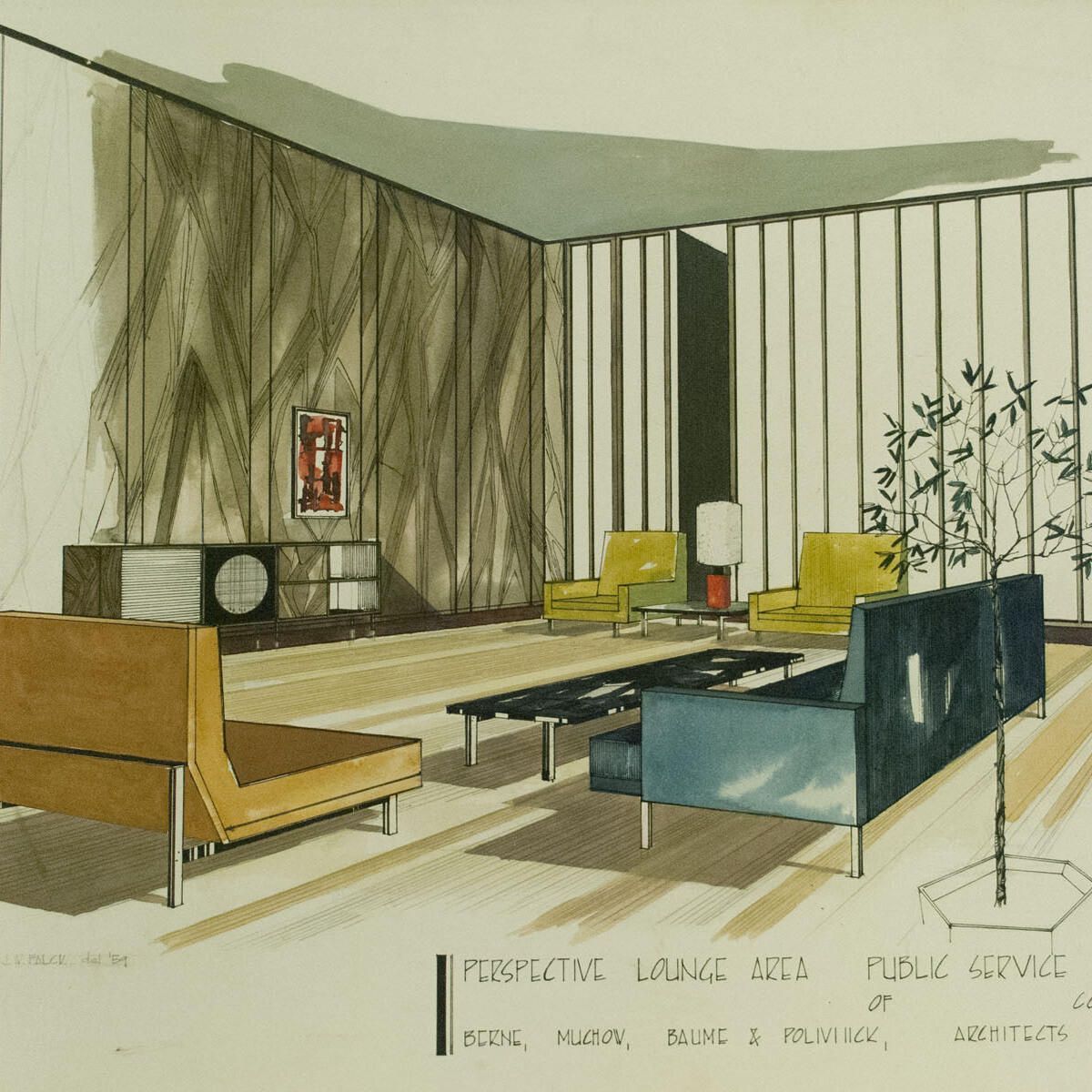 Smudges, borders foxed especially at corners. Interior rendering of proposed waiting room for Berne, Mucha, Baume, Polivinisk Architects.Artwork Details