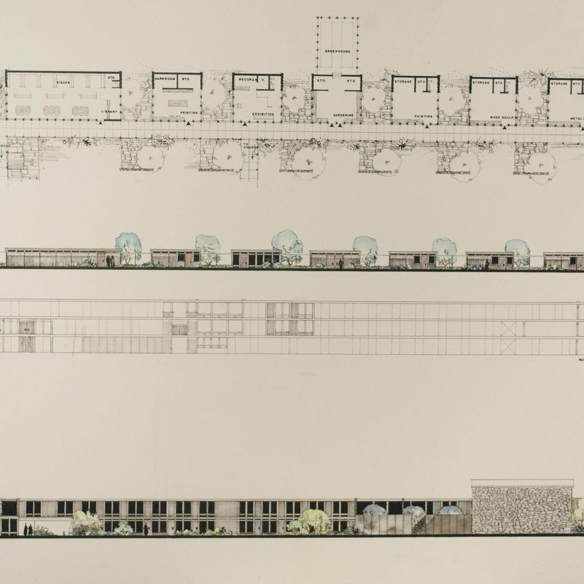 Lake Andrusia Abbey. Visual arts, music, library studios. Foxing, wear in edges. Smudges, abrasions throughout.Artwork Details