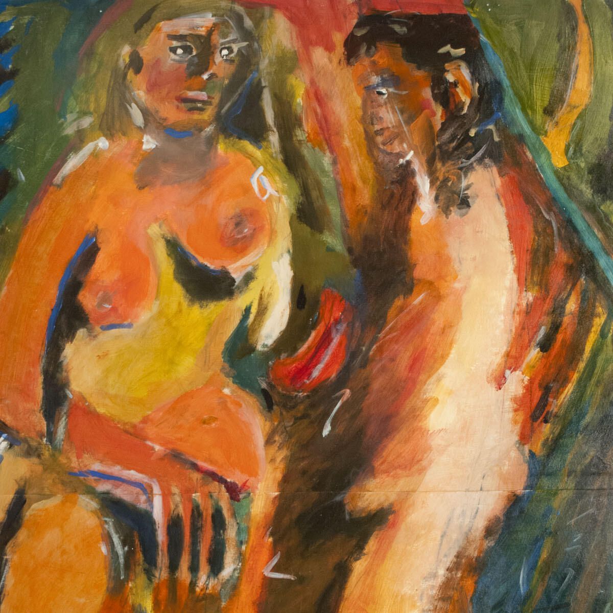 Two sheets adhered together to form larger image area. Large tear in right edge, attempted repair by artist with scrap paper glued on with acrylic medium. Paper creased/compressed in upper-left corner. Image in good condition. Two standing figures. Home series.Dimensions