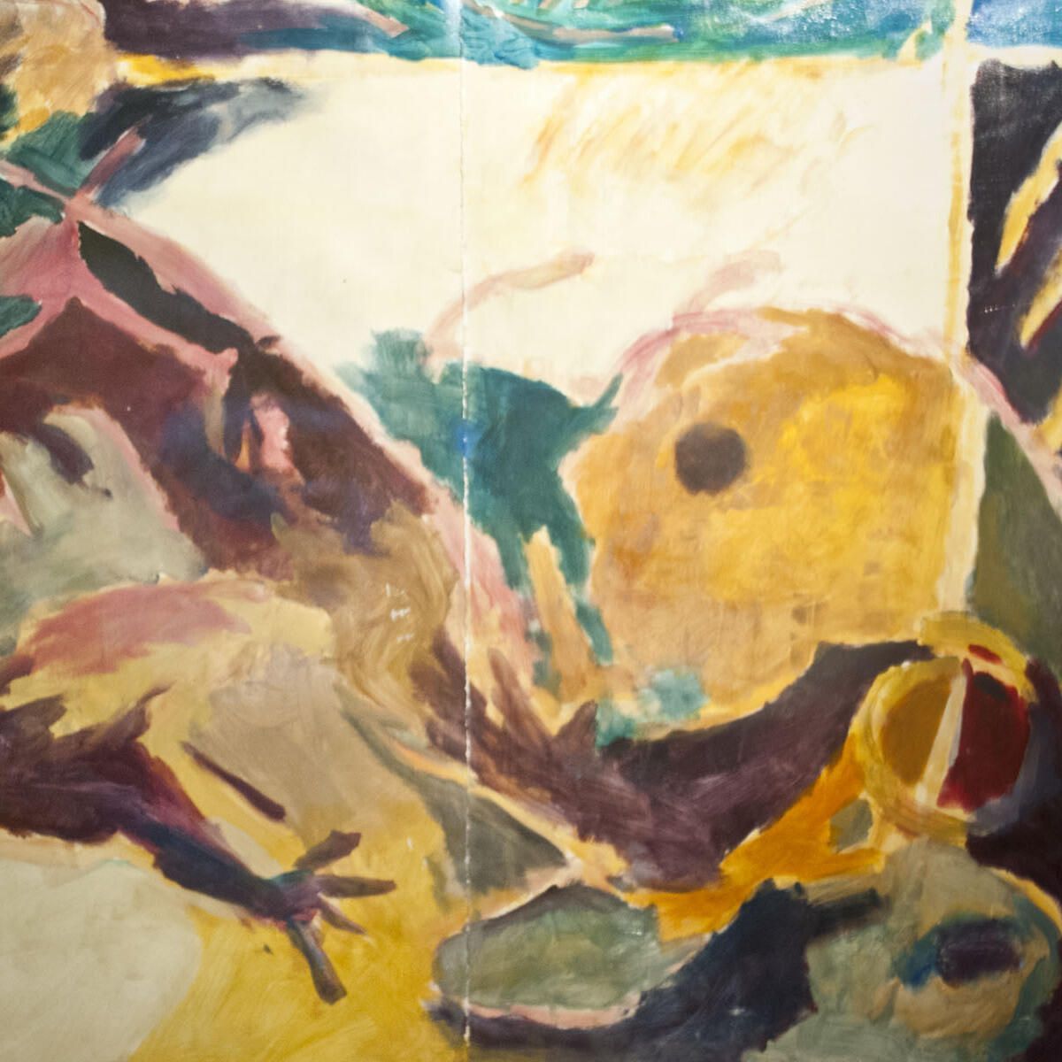 Two sheets adhered together to form a larger image area. Multiple tears in upper-left border. Pinholes in each corner, paint transfers in center of image. Figural.Location
