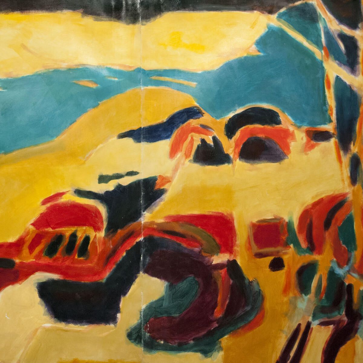 Two sheets adhered to form larger image area. Slight abrasions throughout borders, pinholes in corners. A few small points throughout where pigment has transferred from another painting. Abstract landscape.Dimensions