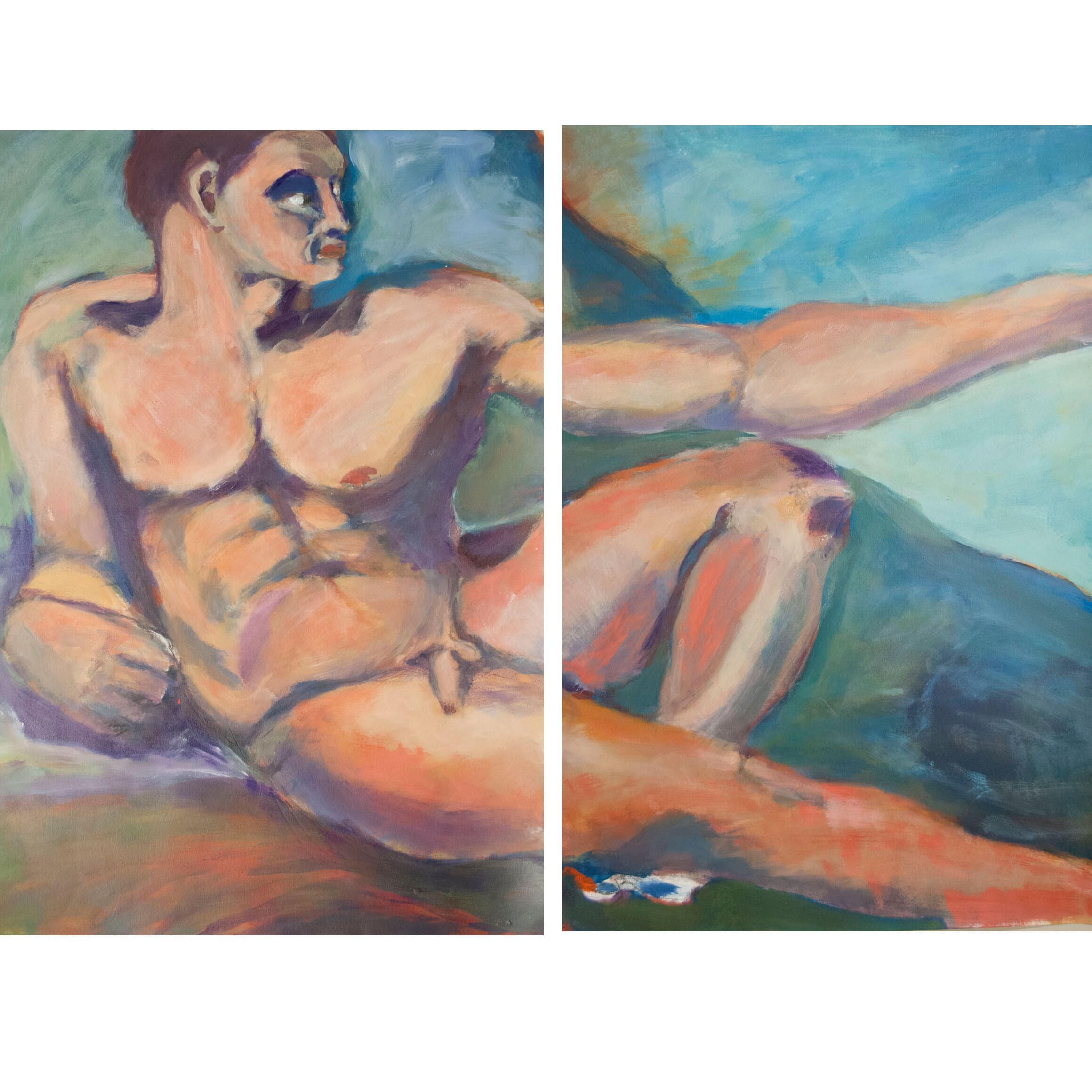 After Michalangelo’s Creation of Man. Seems to be unfinished. Triptych. Overall dimensions: 22 in x 60 in. In overall good condition.Location