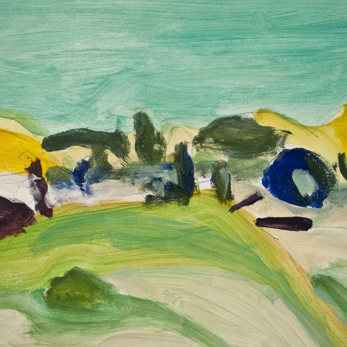 Abstract landscape. In overall good condition. hill, plant, tree, yellow, green, blueArtwork Details