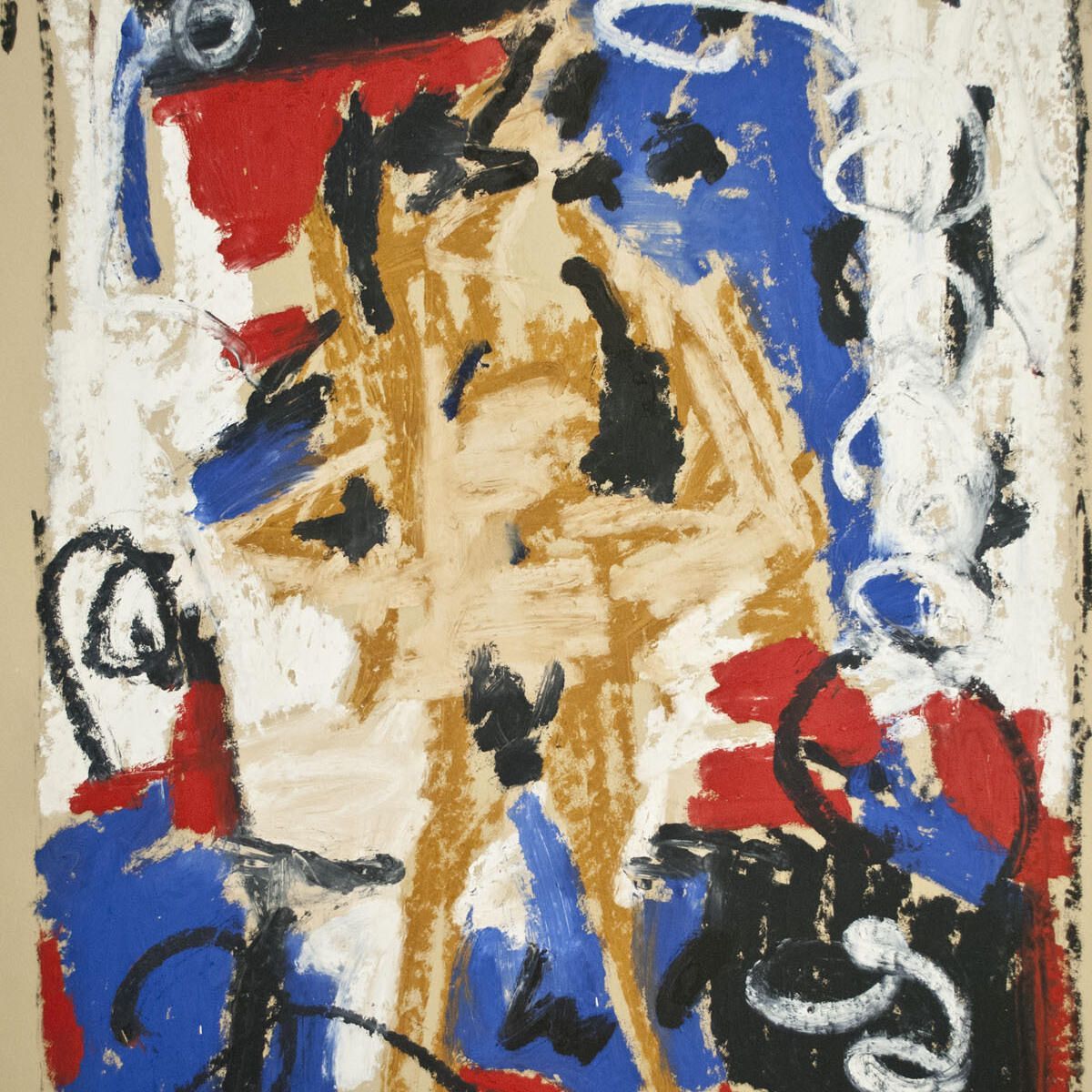 Abstract figure. Pinholes in corners, image in good condition. Series? Red, blue, black, gold, white. patriot, human, strength, abstractLocation