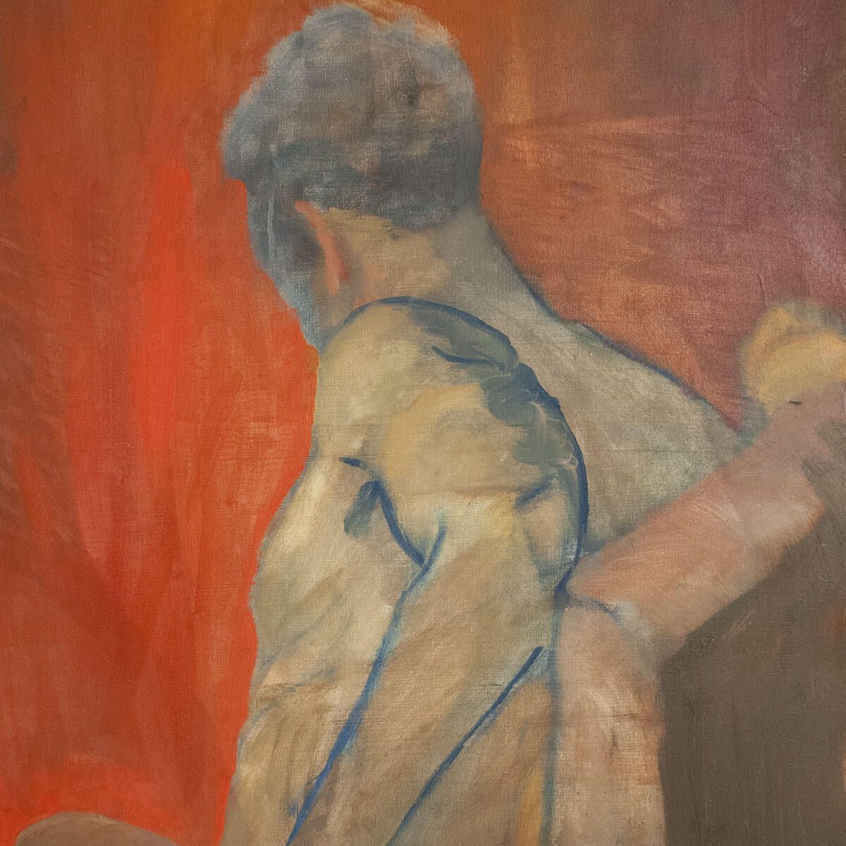 Seated nude male figure, seen from back. Light layer of dust, but otherwise in good condition. red, brown, man, human, womanAcquisition
