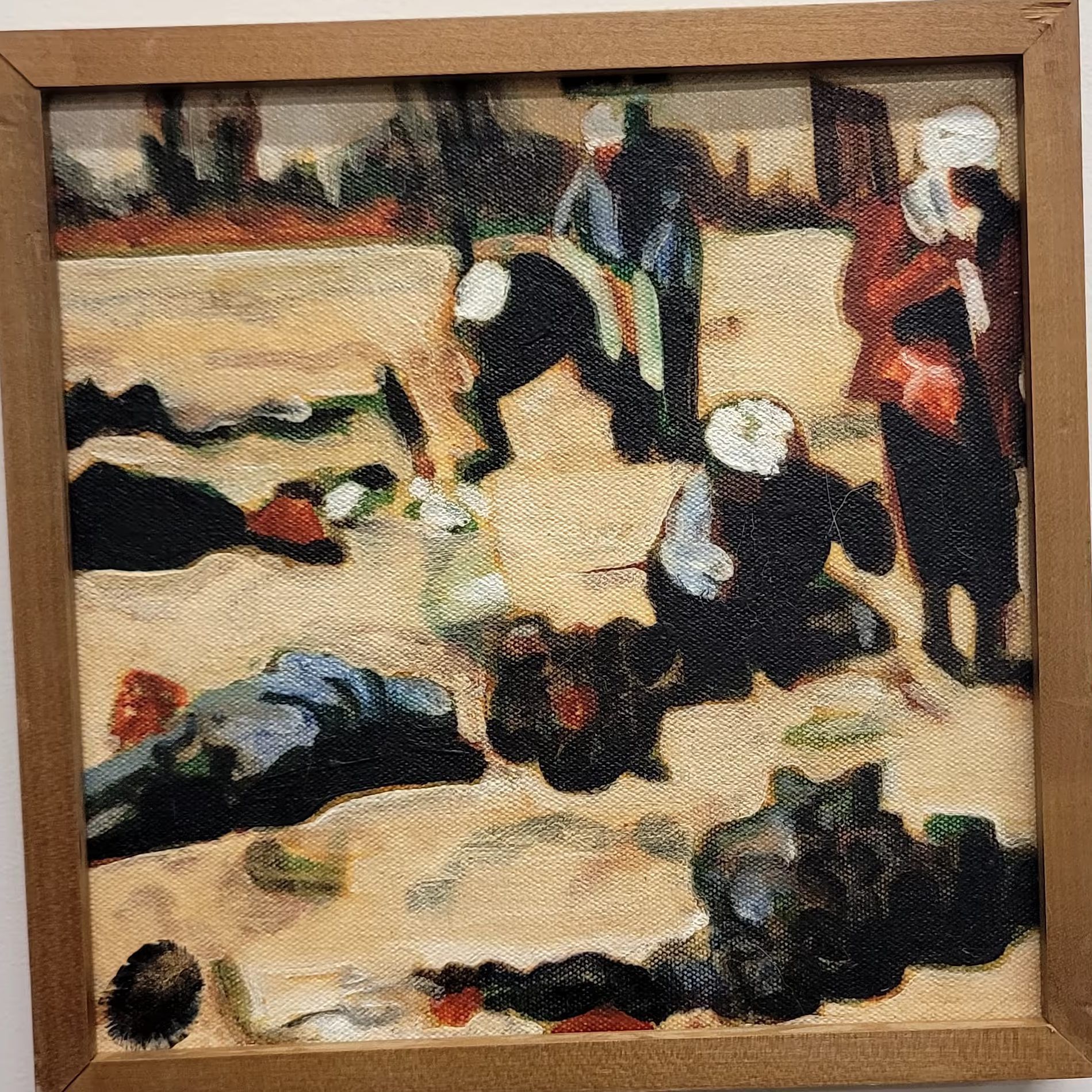 Several figures with white head wraps surveying a desert area with many people dead on the ground. in the far background there are burnt and destroyed buildings. The black fingerprint is in the bottom left this time. Interestingly this is the only piece that has the fingerprint on the left and not the right side. 9/11, desert, death, red, white, sand, humanType of Painting