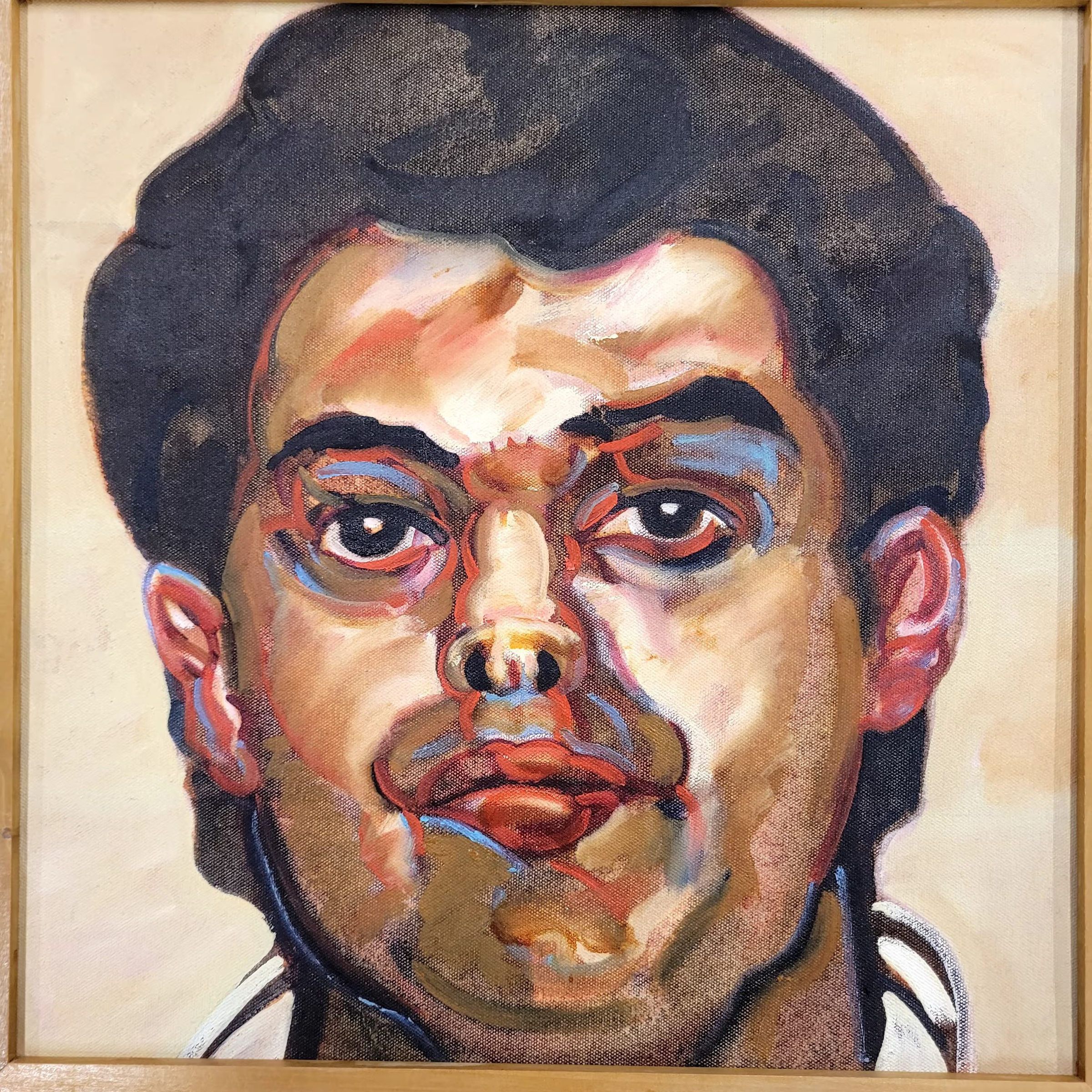 Sandy tan background. Man with black hair and deep eye bags stares straight ahead. Lots of bright blues and reds in the face. 9/11, black, pink, blue, 9/11, humanType of Painting