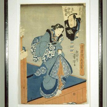 Ukiyo-e woodcut of the Edo period, Japan by Utagawa Kunisada. Kunisada was the most prolific and admired of printmakers during this period. This print depicts the male actor Nakamura Kajaku (seen in the mirror behind the main figure) as a female character. The corners show evidence of water damage but in otherwise good condition. Known by many names, including Utagawa Kuniyoshi, and Utagawa Toyokuni III.Made/Created