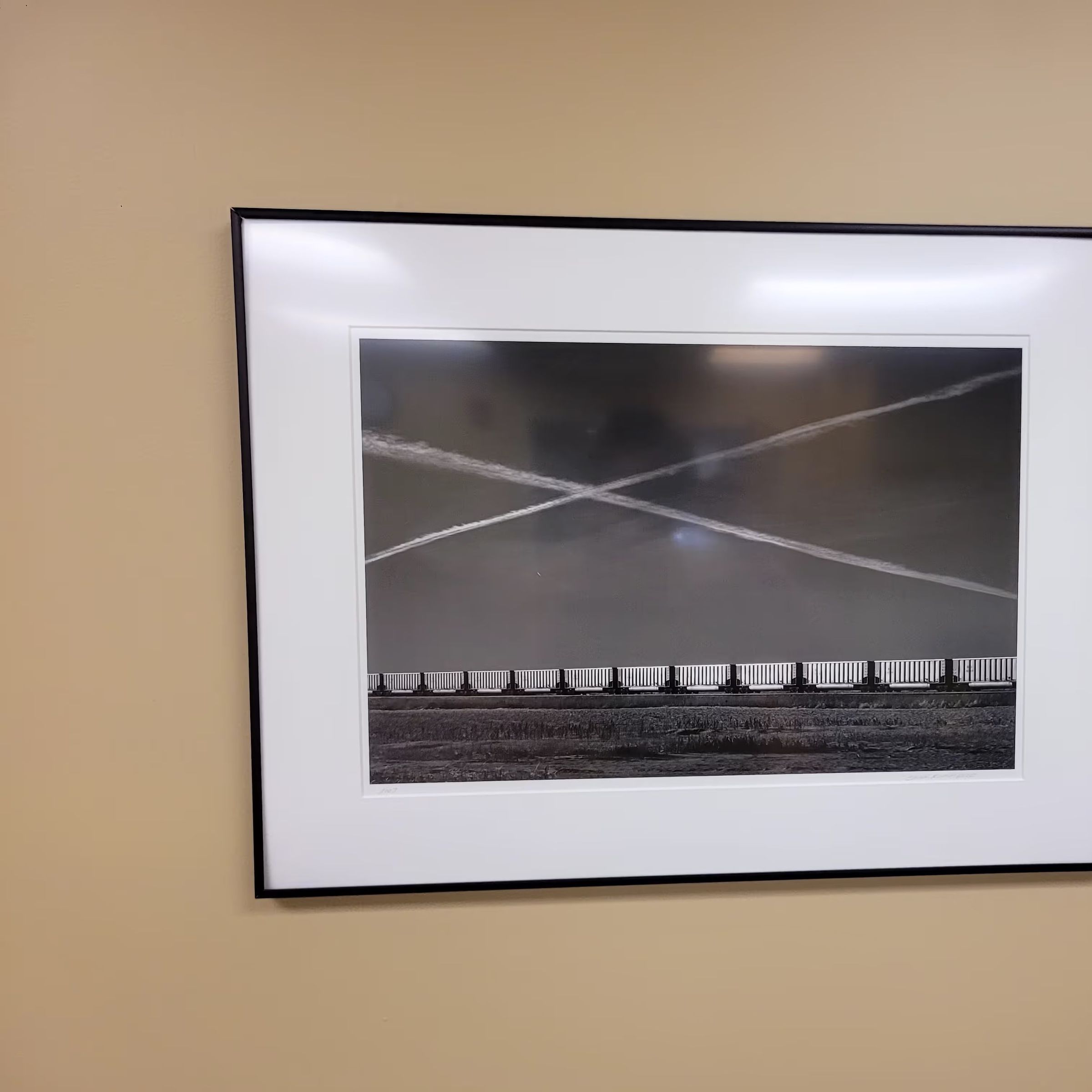 Two contrials from planes (planes not in frame), making an X over 8 trees. Black and white, train, North Dakota, skyCollection