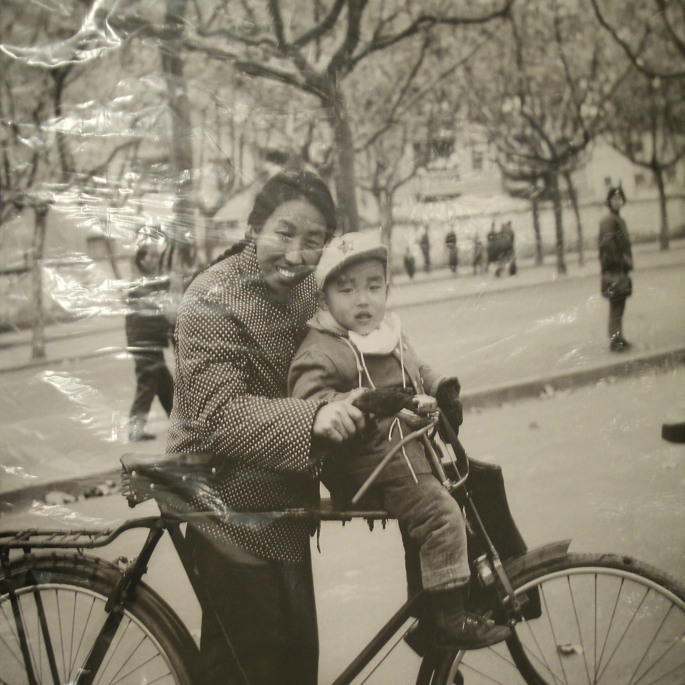 China, bike, bicycle, child, human, adult, black and white, retake, standing, fashionCollection