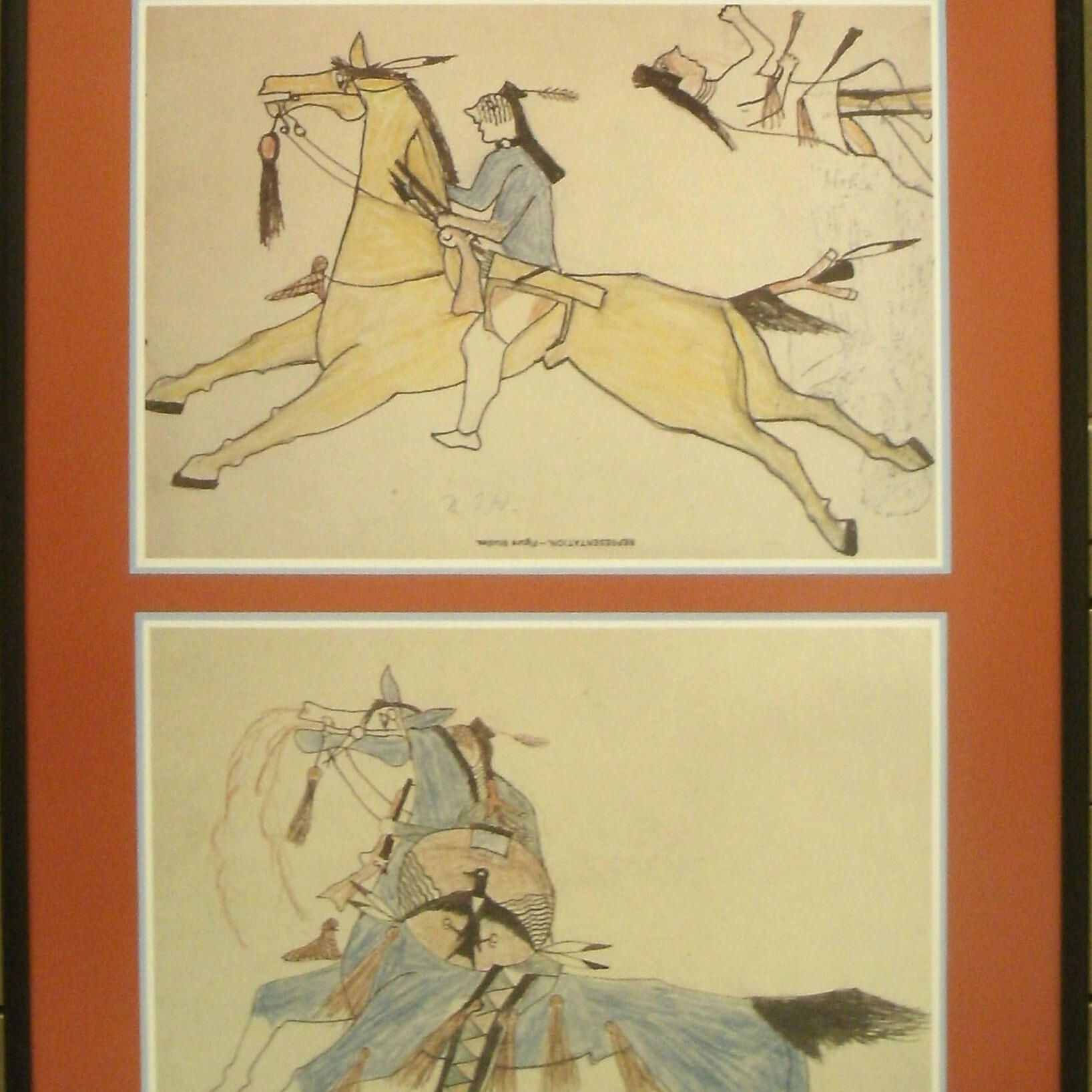 Apple Creek, Indigenous culture, human, sitting, horse, animal, blue, yellow, red, white, posterCollection