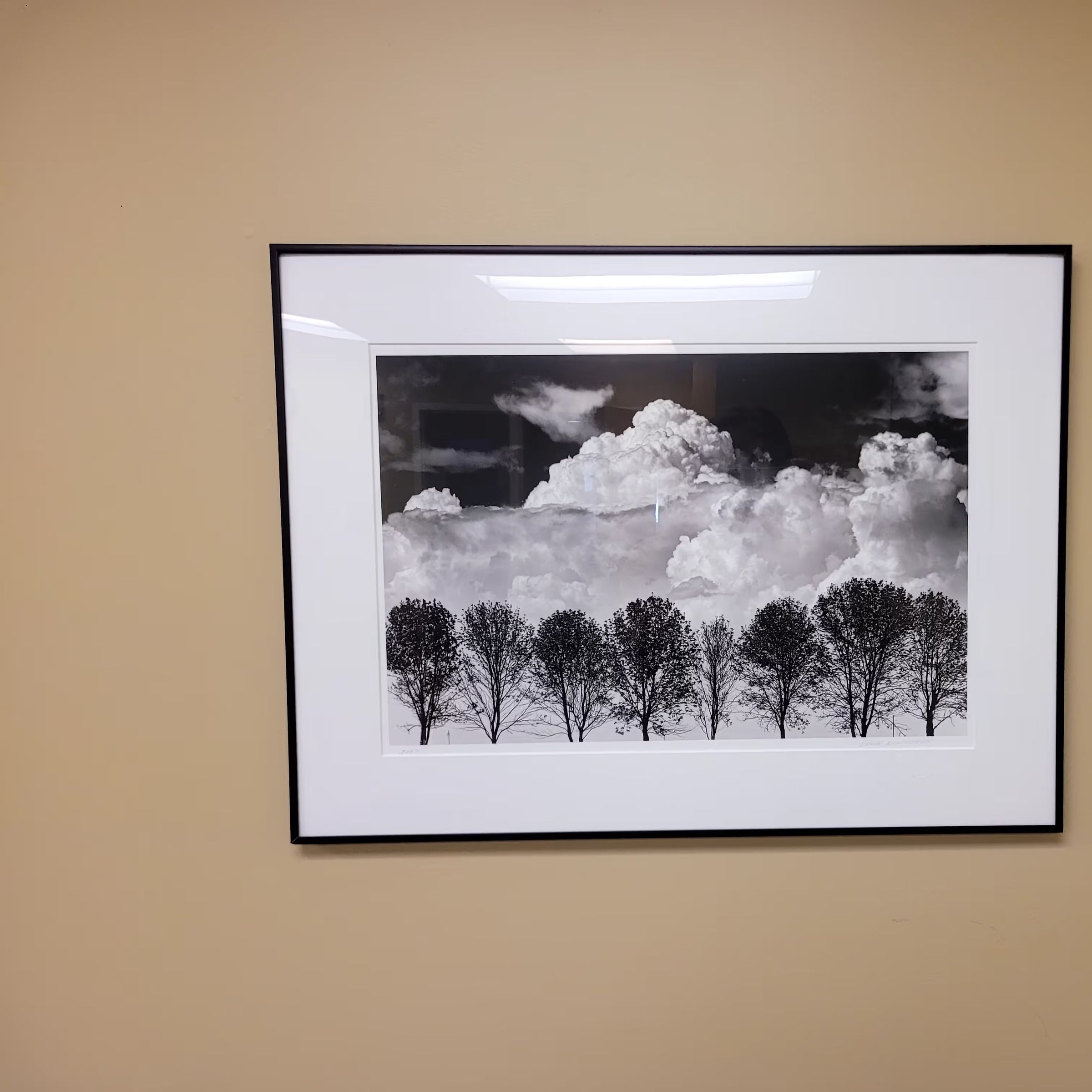 8 trees with huge clouds above them and a chasm of darkness above that. black and white, trees, plants, clouds, North DakotaCollection