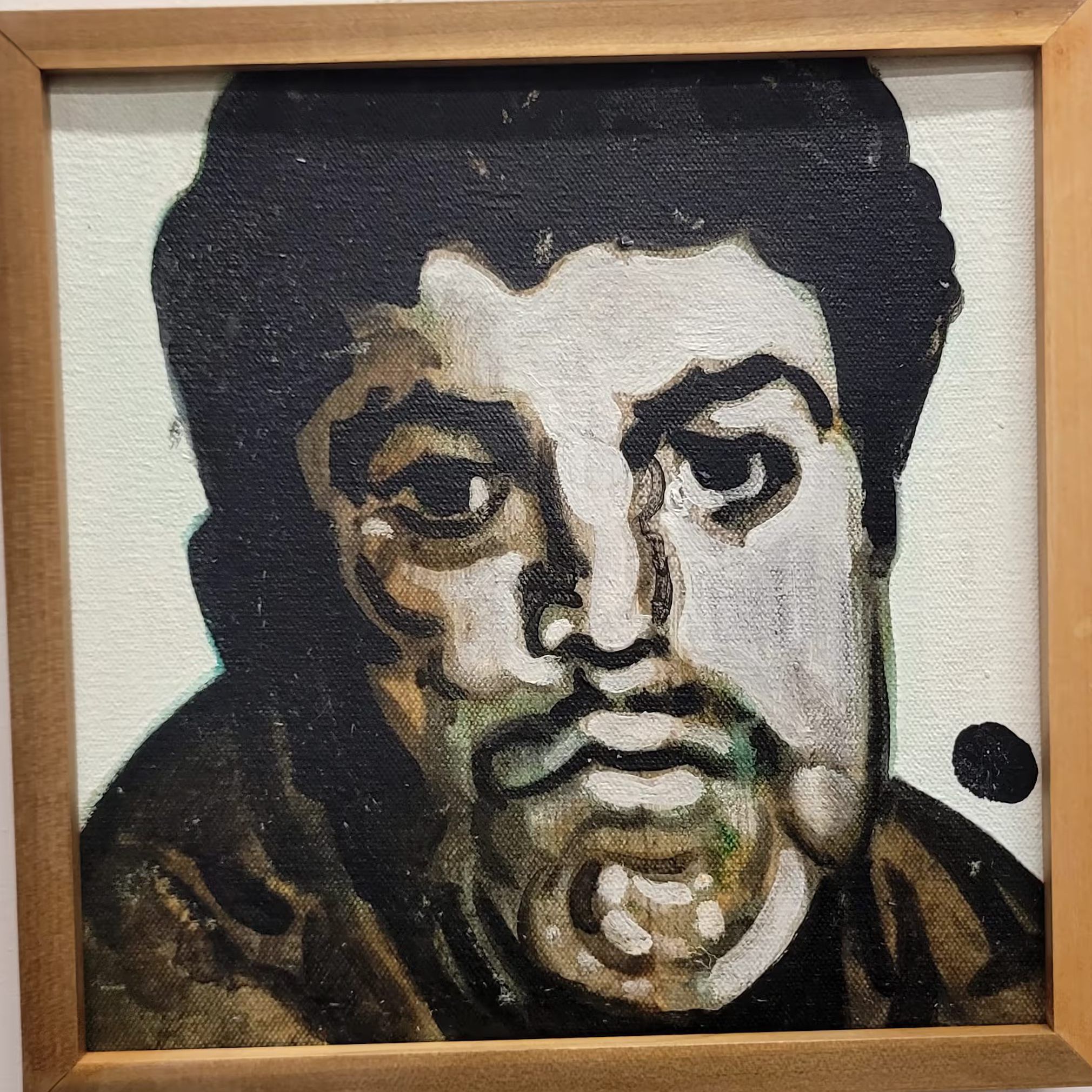 Black, white, grey, green, and yellow. Profile of a larger man, deep chin lots of rolls and curls on his face. Black fingerprint on lower right side of painting. Background matches skin tone grey. grey, black and white, human, 9/11, manType of Painting