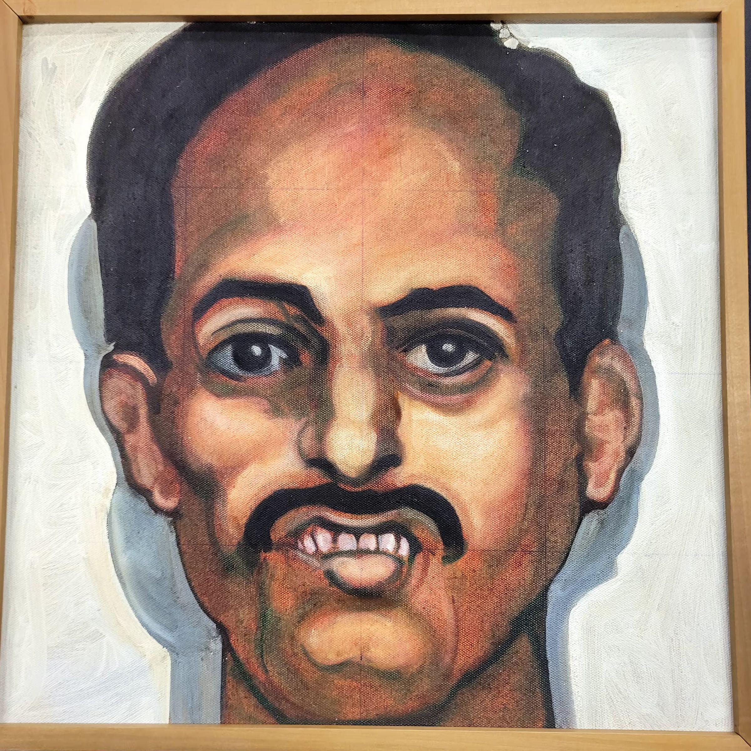 A mustached man with his top teeth out. The background is white with the mans shadow on both sides. Grid pattern is there. 9/11, man, human, mustache, brown, black, white, red, yellowType of Painting