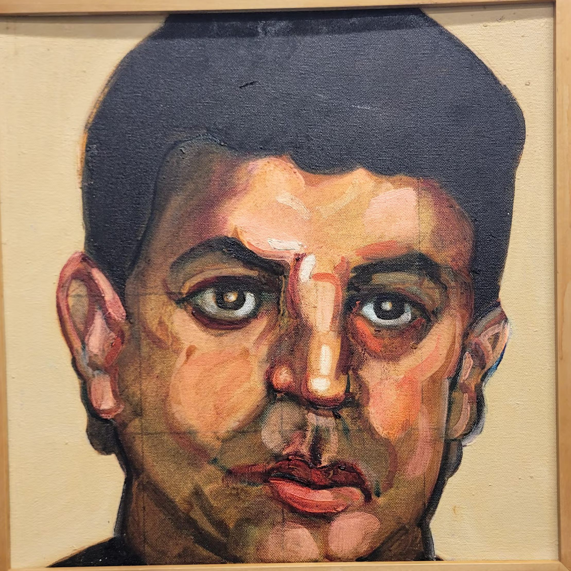 Sandy grey background. Profile of a man. Pencil grid pattern to lay face out is visible. Short black hair, only neck no shoulders. 9/11, human, man, black, brown, yellow, whiteType of Painting