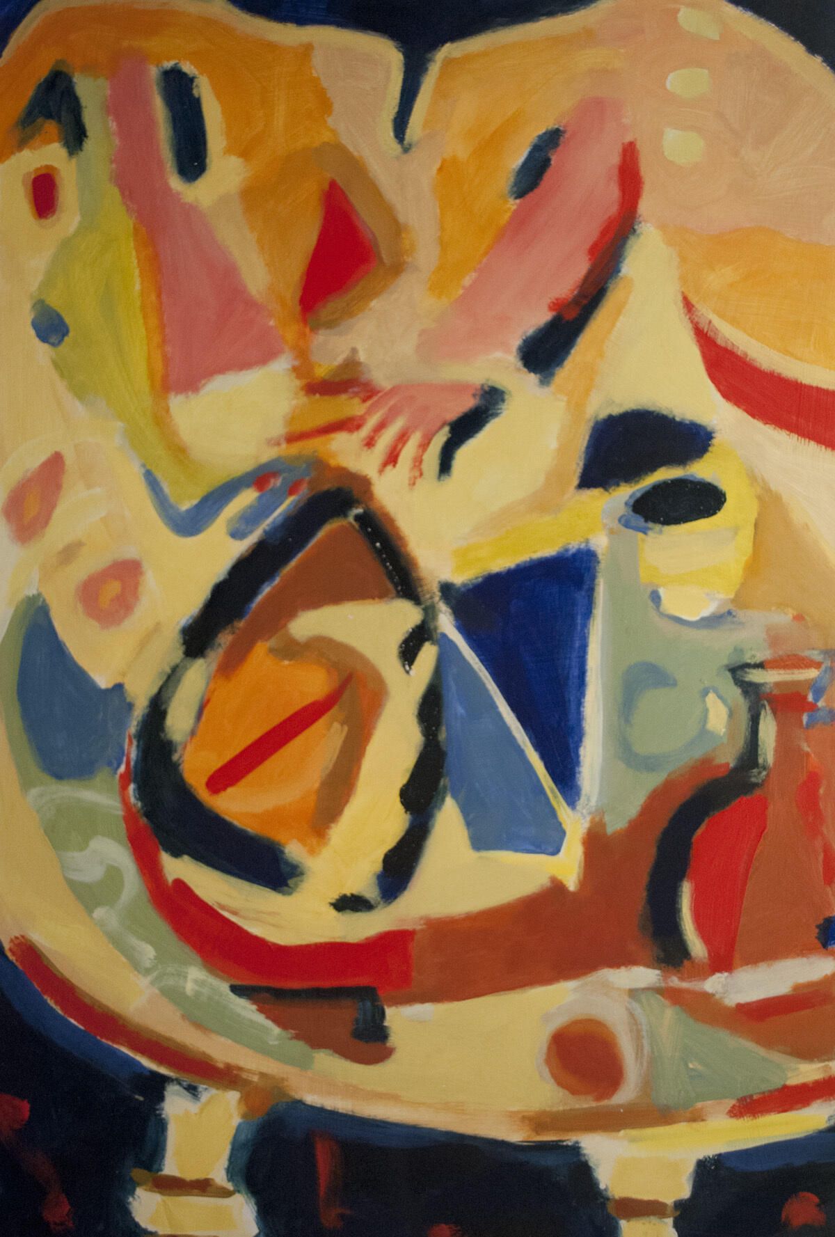 Dark, raised areas have paper adhered in image. Abrasions and smudges in borders. Abstract figure, still life. Columbus Ave. series.Location