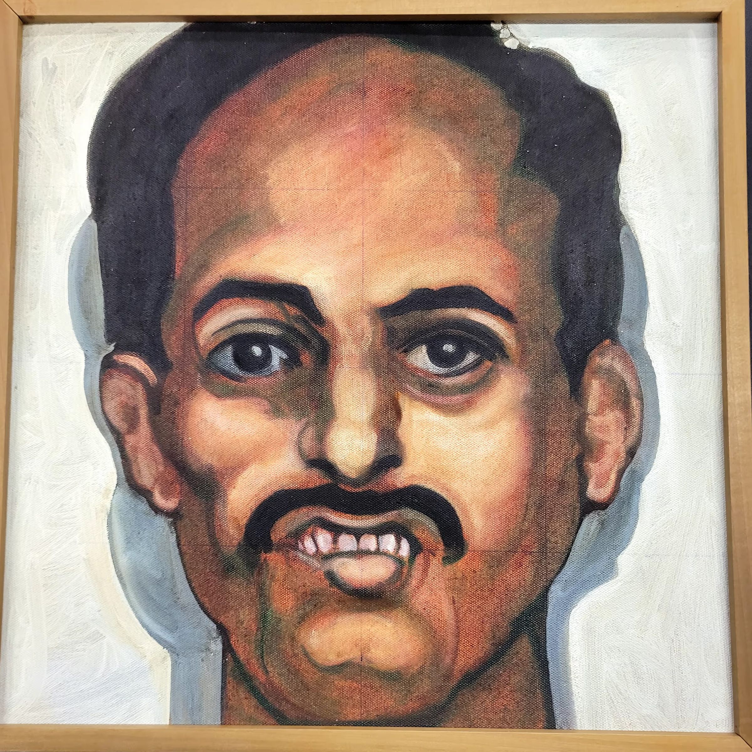 A mustached man with his top teeth out. The background is white with the mans shadow on both sides. Grid pattern is there. 9/11, man, human, mustache, brown, black, white, red, yellow