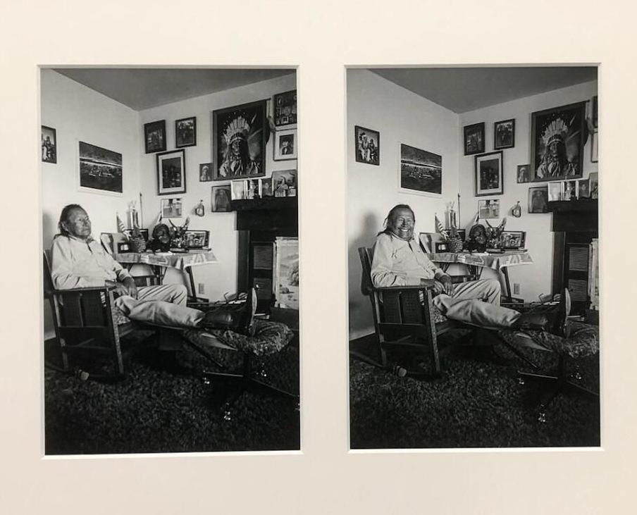Two side-by-side photos of Austin Two-Moons one in which he is stoic and the other he is laughing. Black and white, human, man, room, chair, pictures, indigenousPhotograph Details