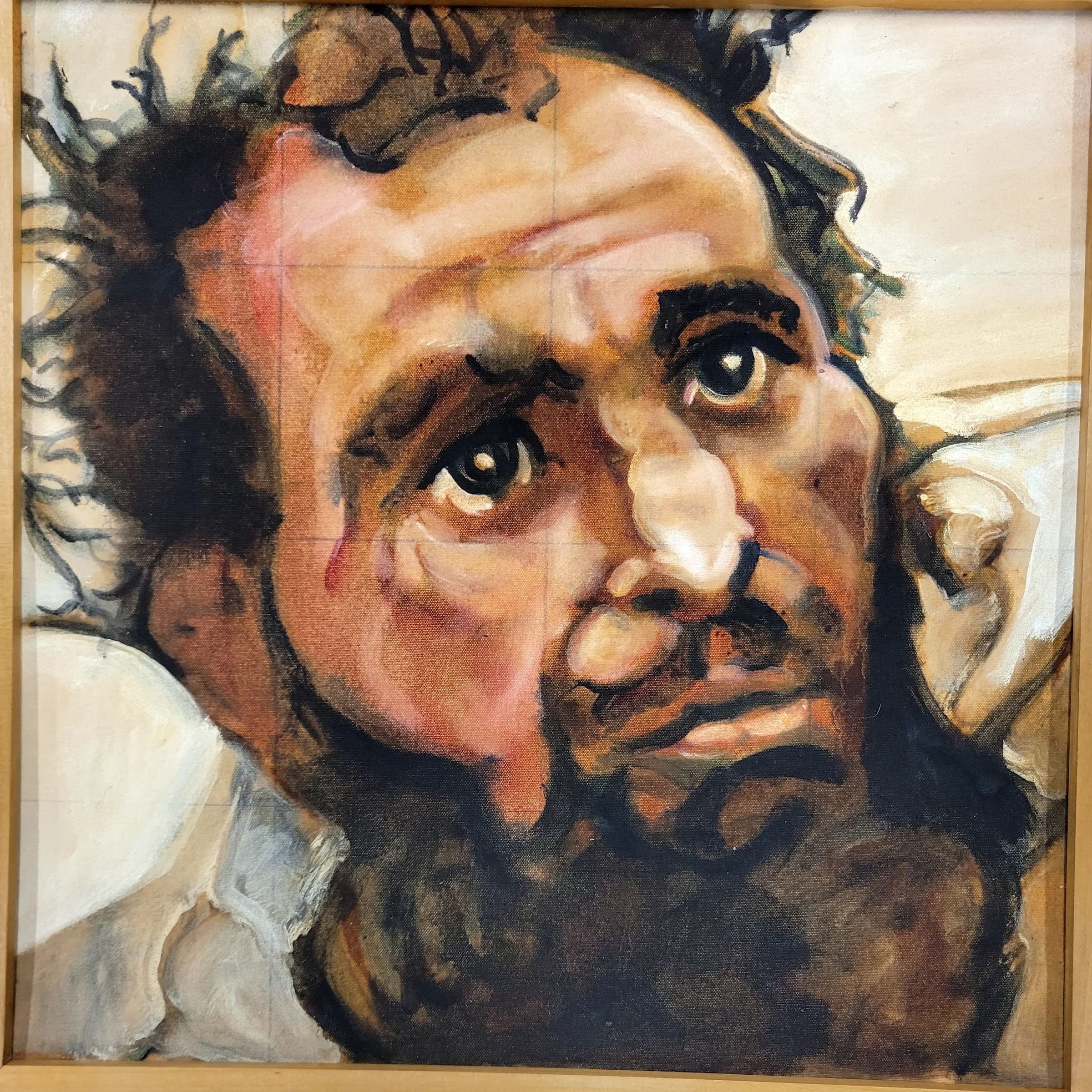 A man leaning left with crazy hair all over the place. Grid pattern is visible, 9/11, brown, grey, black, white, red, human, man, beardType of Painting