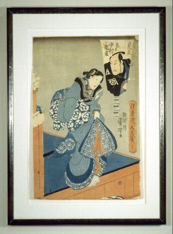 Ukiyo-e woodcut of the Edo period, Japan by Utagawa Kunisada. Kunisada was the most prolific and admired of printmakers during this period. This print depicts the male actor Nakamura Kajaku (seen in the mirror behind the main figure) as a female character. The corners show evidence of water damage but in otherwise good condition. Known by many names, including Utagawa Kuniyoshi, and Utagawa Toyokuni III.Made/Created