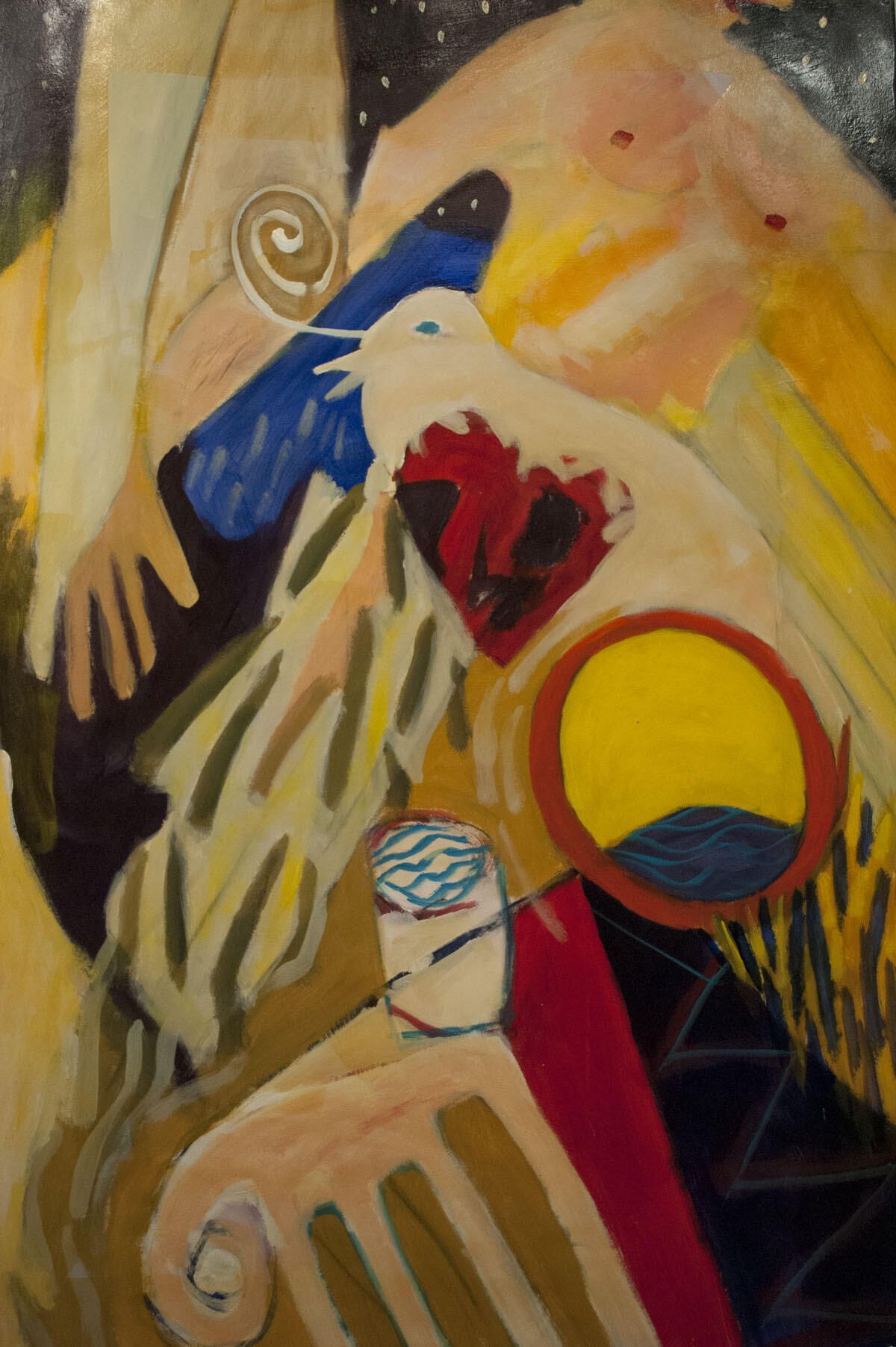 Pinholes in corners of image. Small points of white paint transfer. Symbolic image with human figures.Location