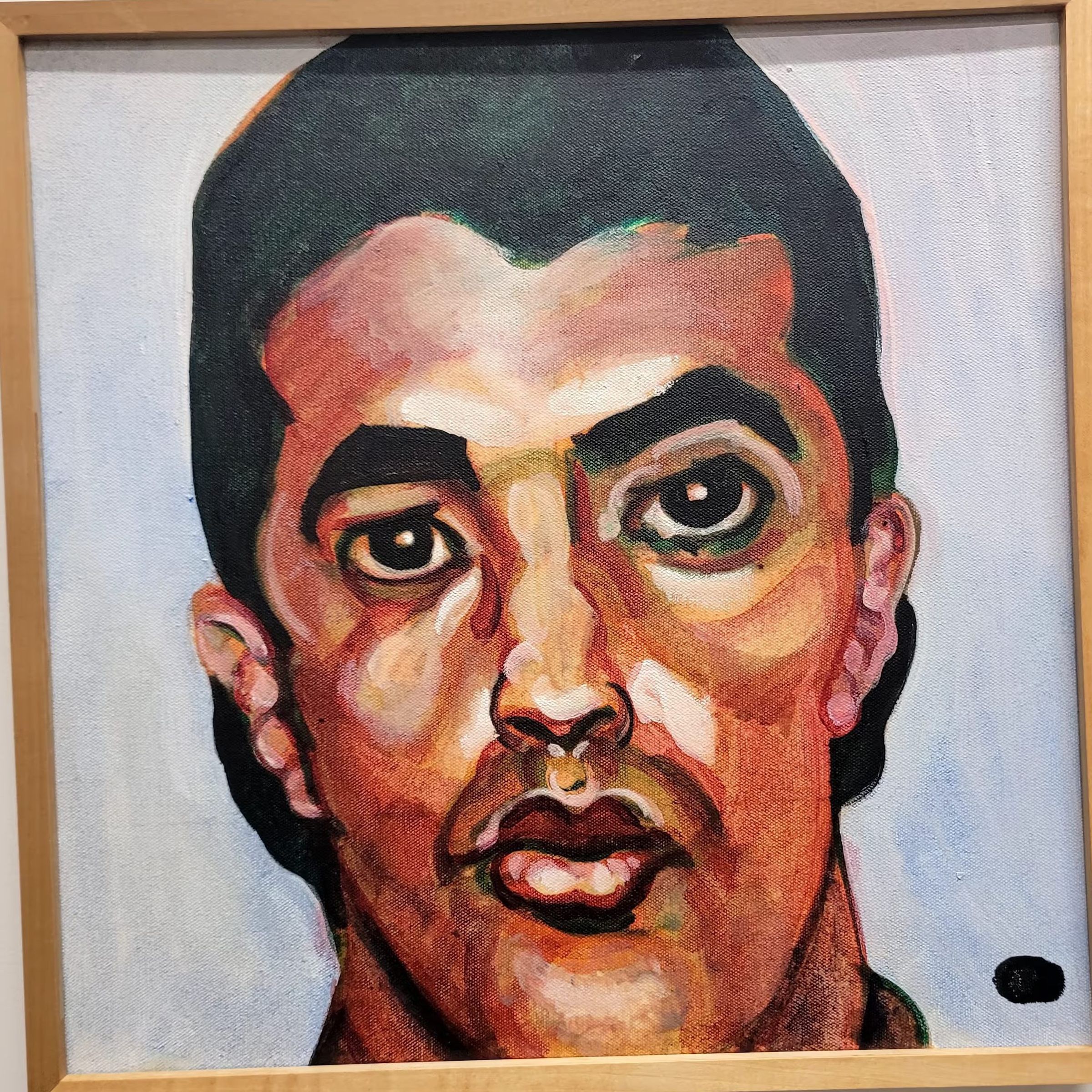 Just head, no shoulders. Short black hair, clean shaven, lots of reds used in the face. Black fingerprint in bottom right corner. Baby blue background. brown, red, 9/11, white, black, human, manType of Painting