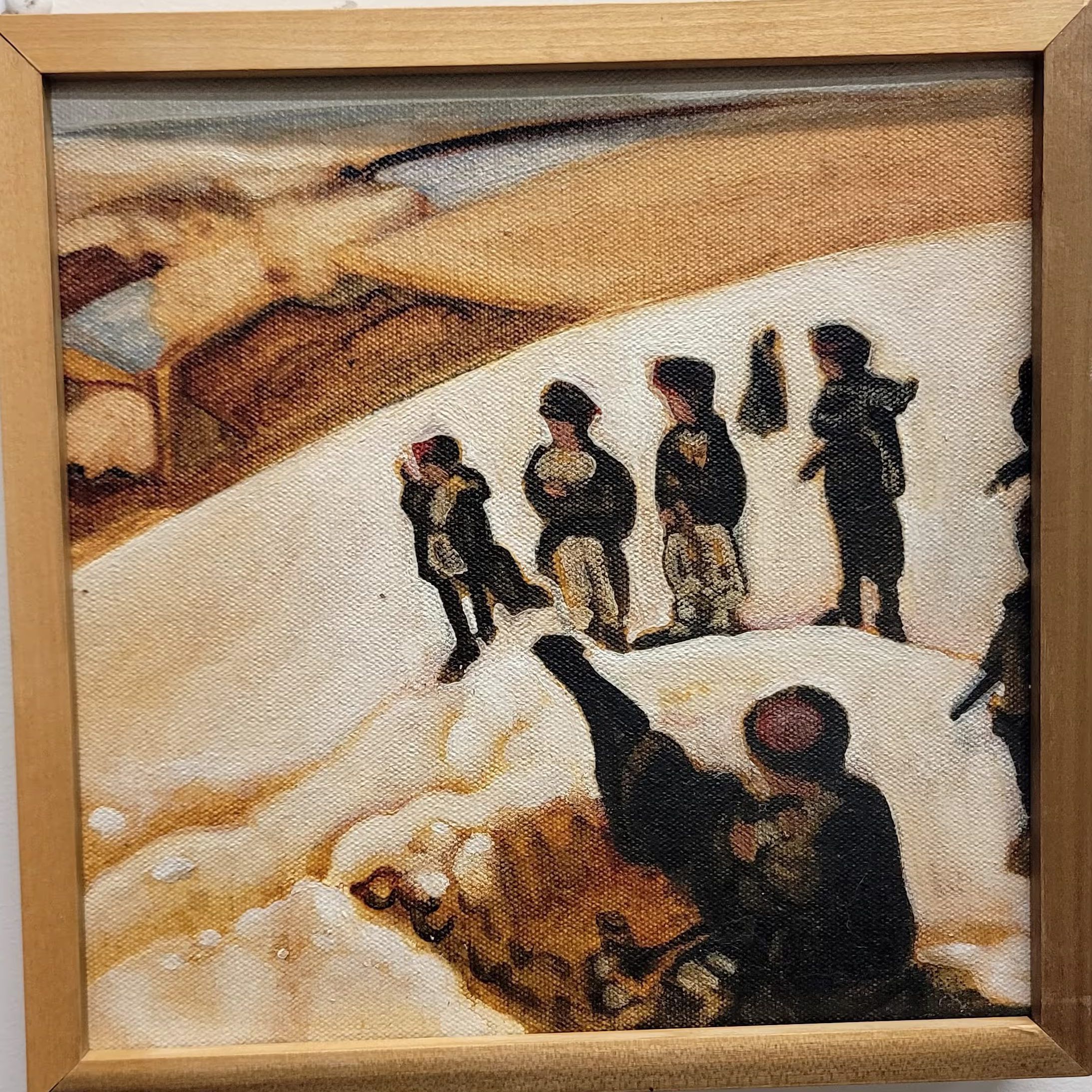 Desert. One figure in red hat in the right corner. Four figures center frame. 1 small figure behind them. On the right side figures are cut off. Sand, soldiers, war, 9/11, brown, white, black, human, historyType of Painting