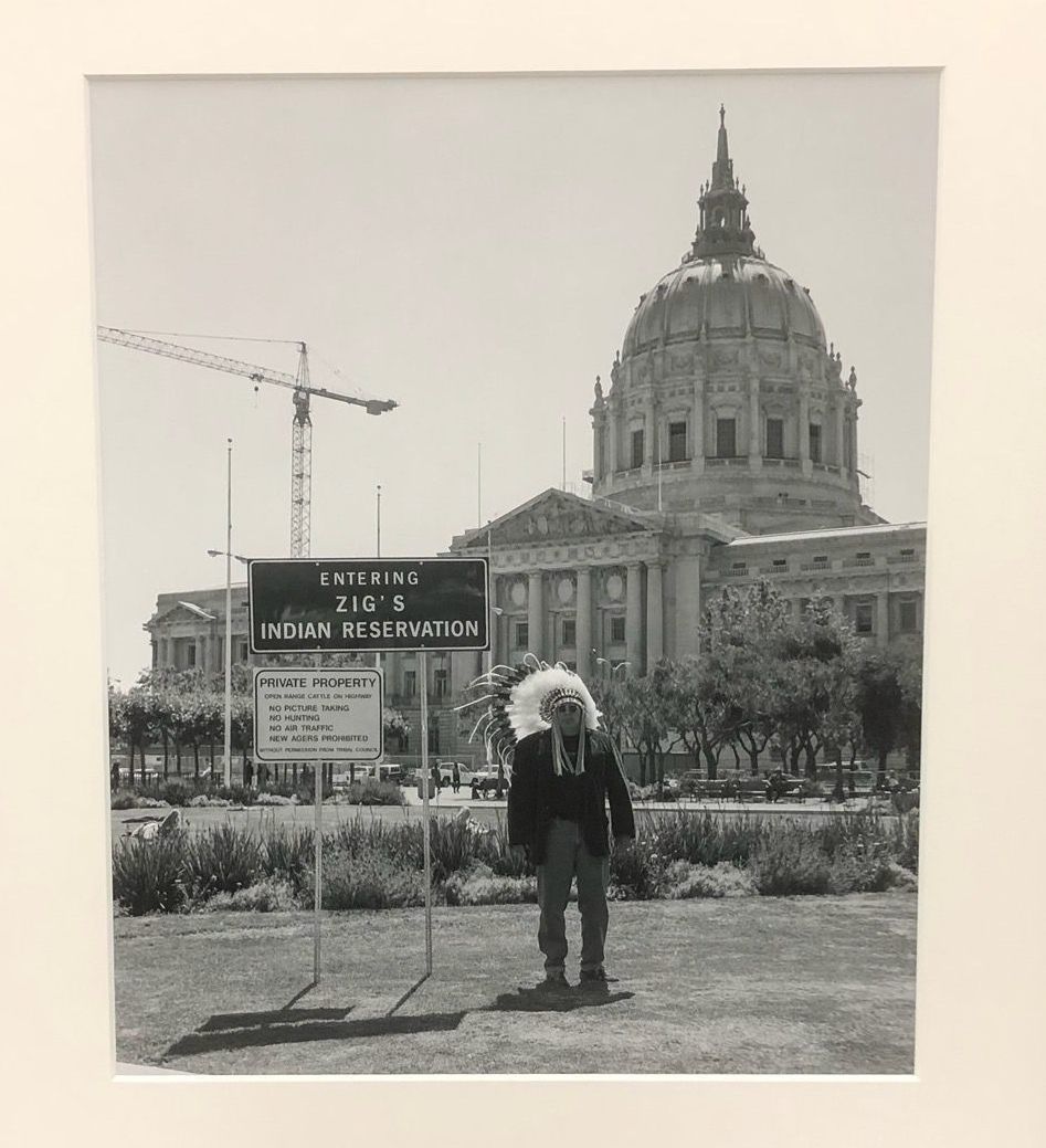 Zig Jackson's "City Hall" piece. Black and white, human, man, indigenous, signsPhotograph Details