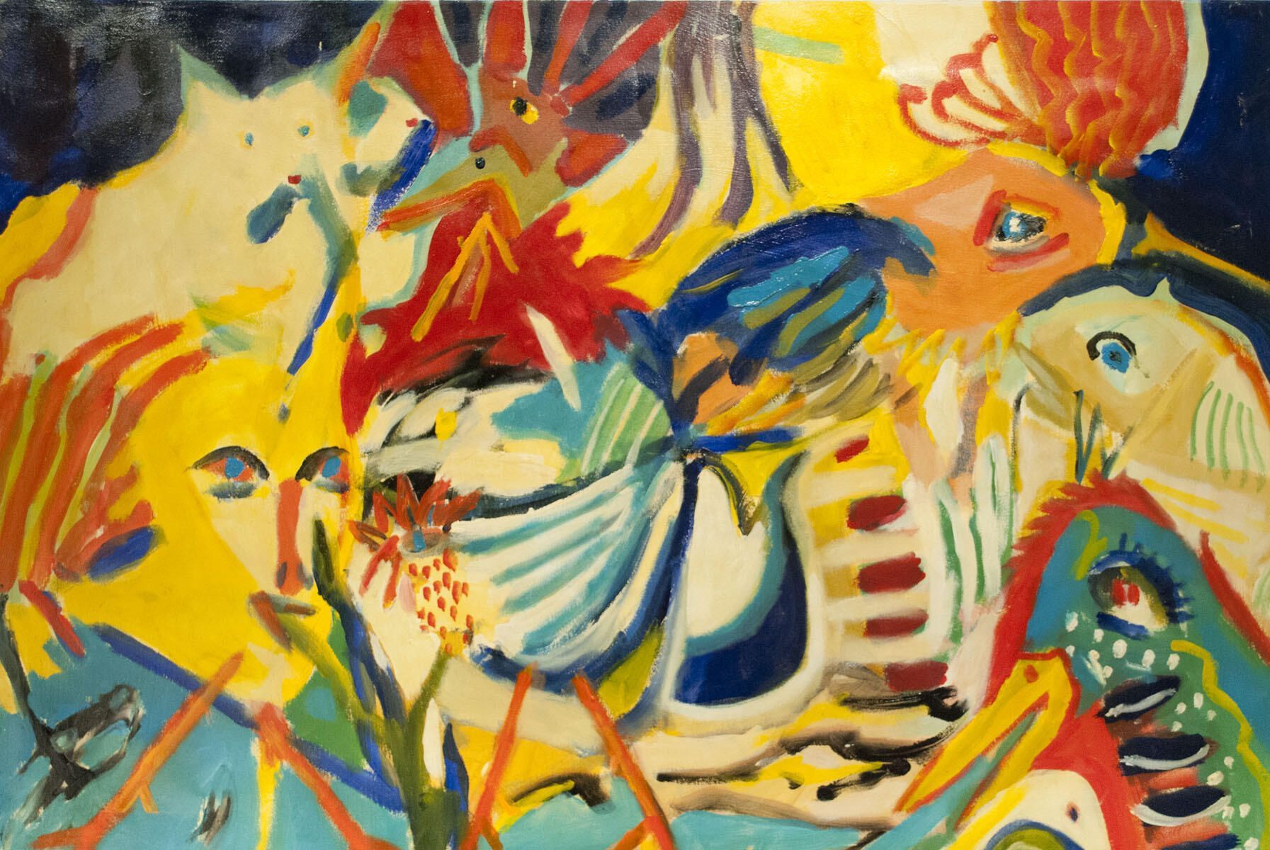 Tears in lower-left corner, pencil marks and creases in borders. Image in good condition. Stylized figure with animals. Montserrat Series.Dimensions