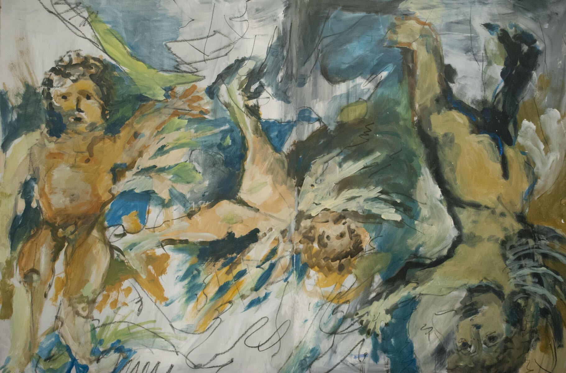 Two sheets adhered to form larger image area. Small points throughout image where paint has been lifted or chipped off. Three figures of cupids.Artwork Details