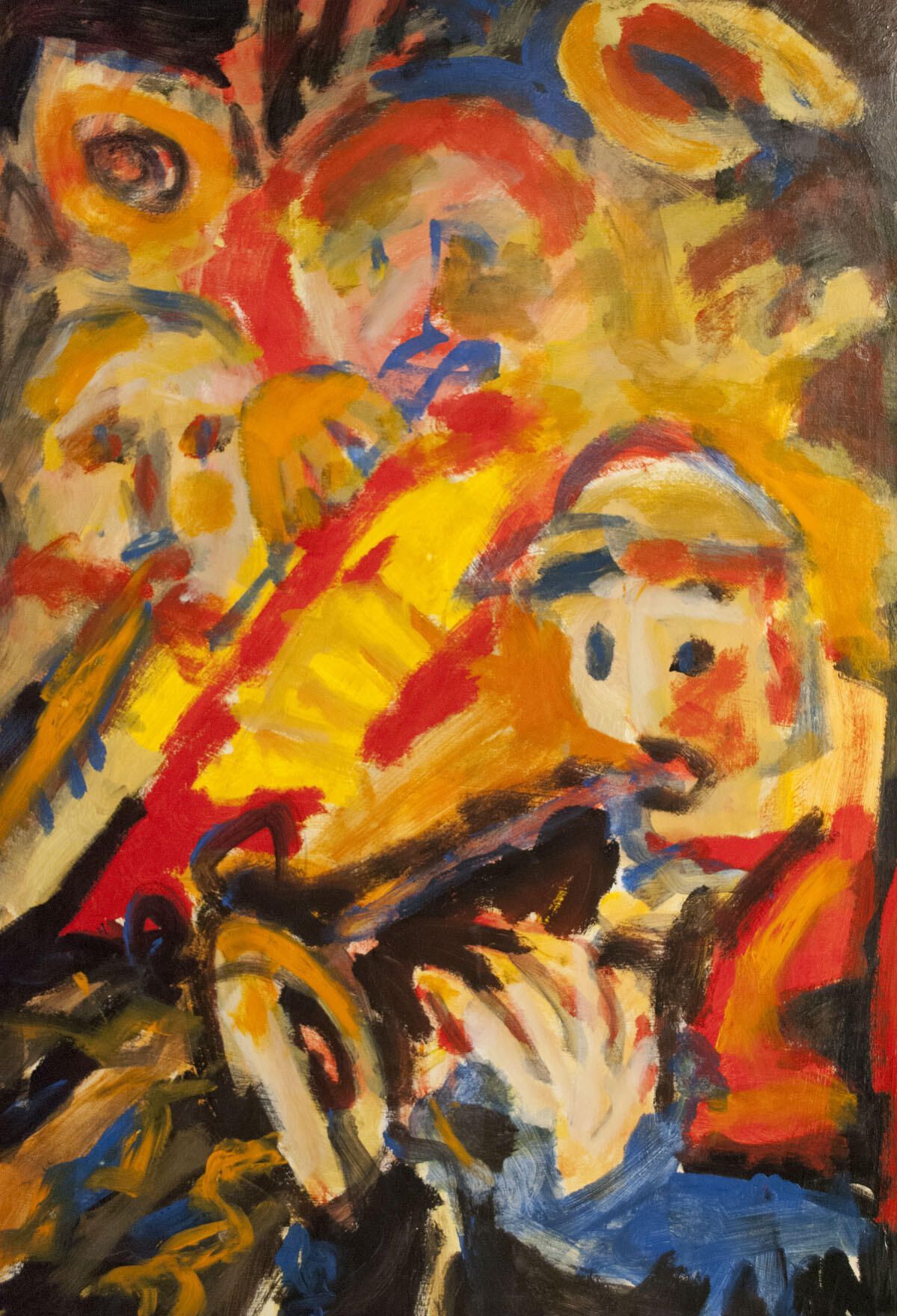 Pinholes in corners of images. Few points of paint transfer throughout image. Tear in image, repaired by artist with scrap paper and acrylic medium. Smudges in borders. Musicians playing. Montserrat Series.Location