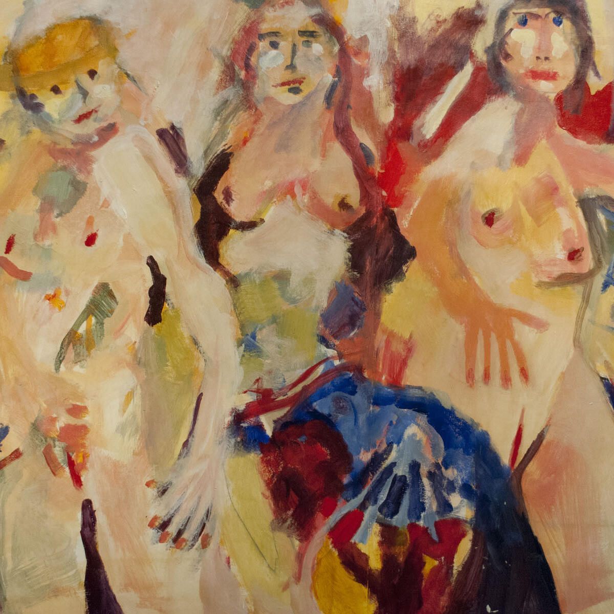 Two sheets adhered together to form larger image area. Smudges in borders, pigment transferred throughout the image from another painting. Three nude female figures.Dimensions