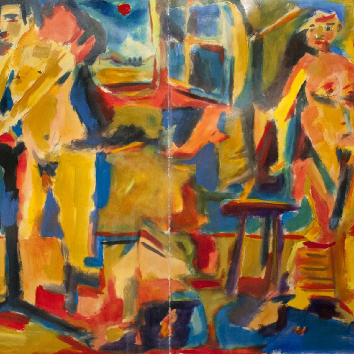 Two sheets adhered together to form a larger image area. Smudges and pencil marks in border. Right figure has puncture through paper at the nose. Two nude figures. Columbus Street series.Dimensions