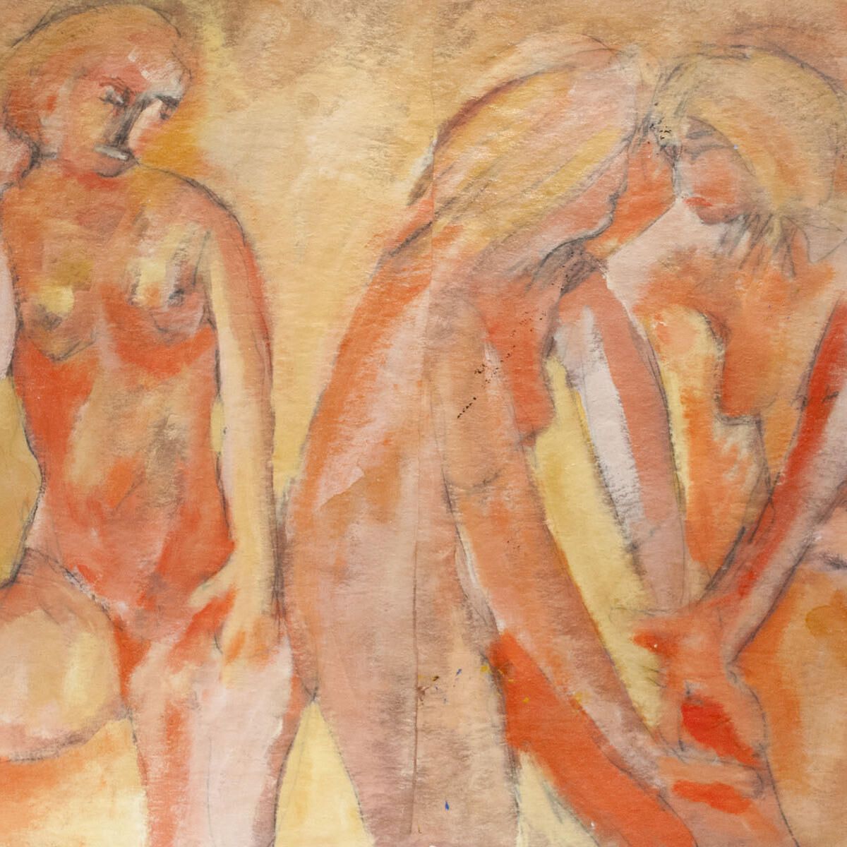 Two sheets adhered together to form a larger image area. Black, blue, white pigment transferred throughout from another painting. Tears in lowerleft and lower-right corners. Three nude female figures. Mateus series.Artwork Details