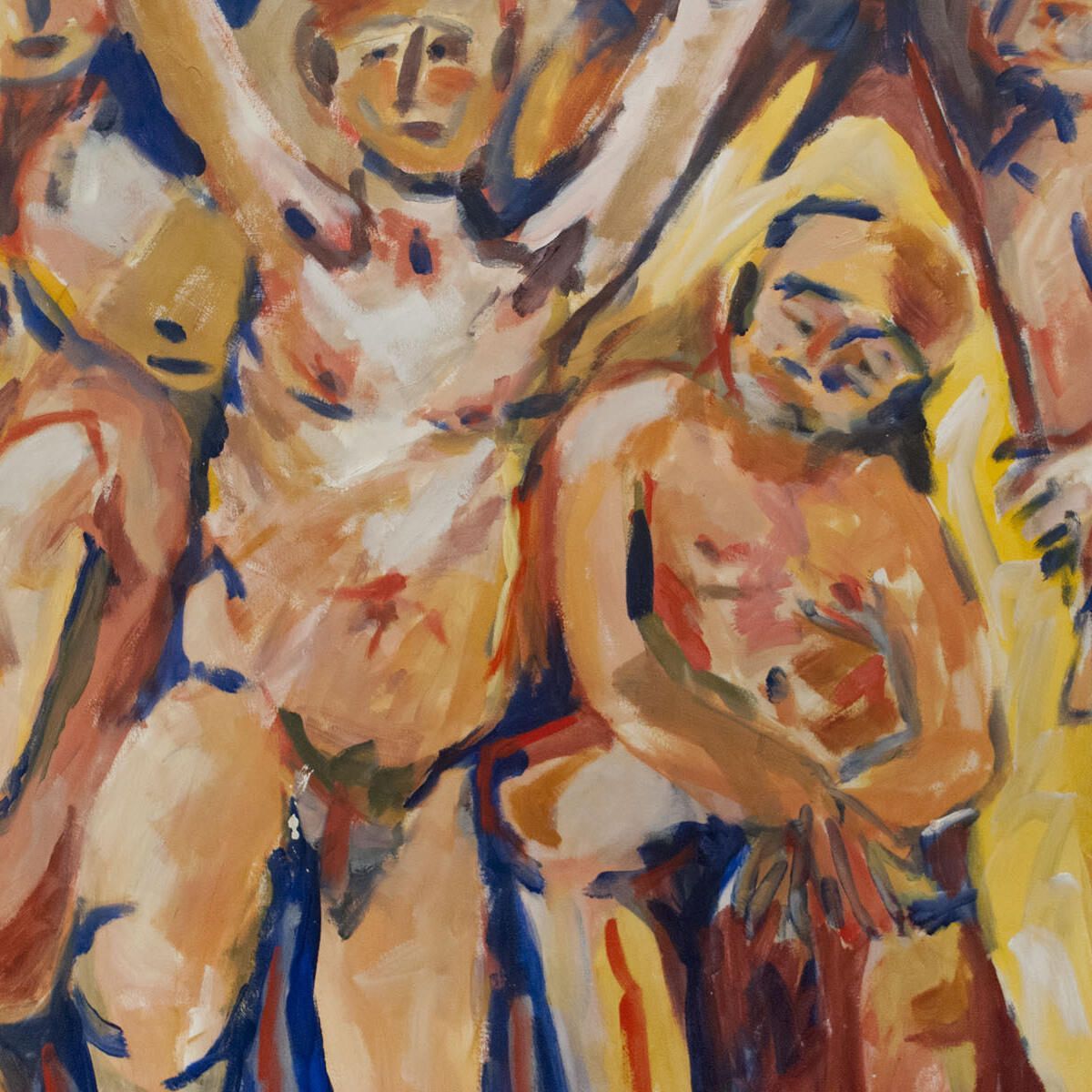 Two sheets adhered together to form a larger image area. Pencil marks, tears, smudges in borders—some going into image. Paint transferred from other work. Group of nude males.Dimensions