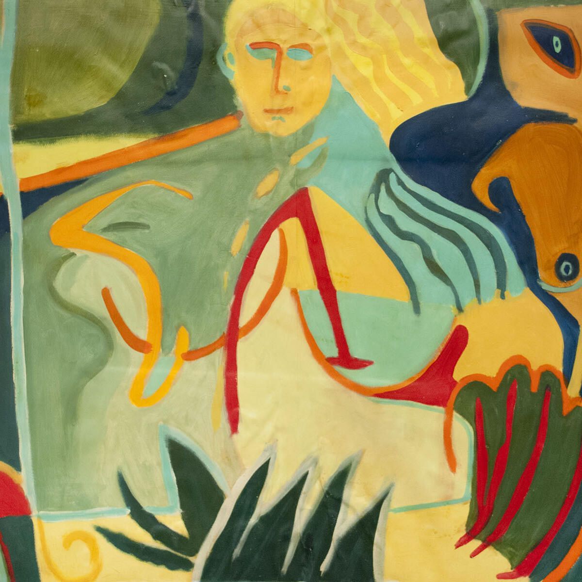 Small tears, abrasions in borders. Extensive buckling and creasing of paper throughout image. Female figure, nature setting. San Miguel series.Dimensions