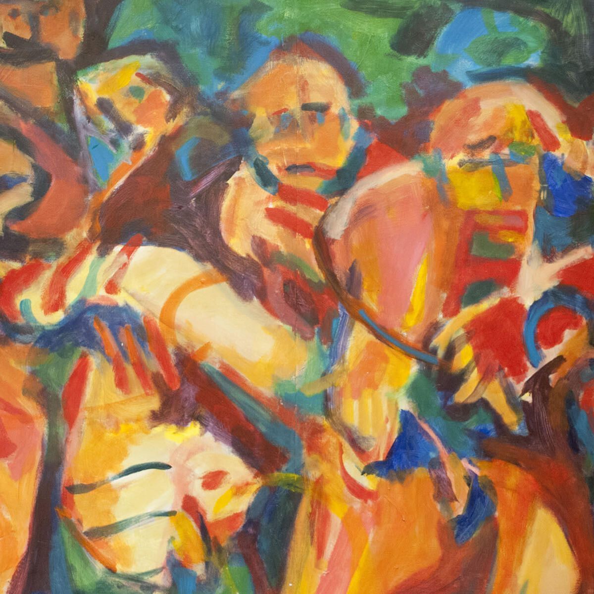 Two sheets adhered together to form larger image area. Pinholes in each corner. Smudges in borders. Small points of pigment transferred from another work throughout image, otherwise image in good condition. Group of male figures. Mateus series.Dimensions