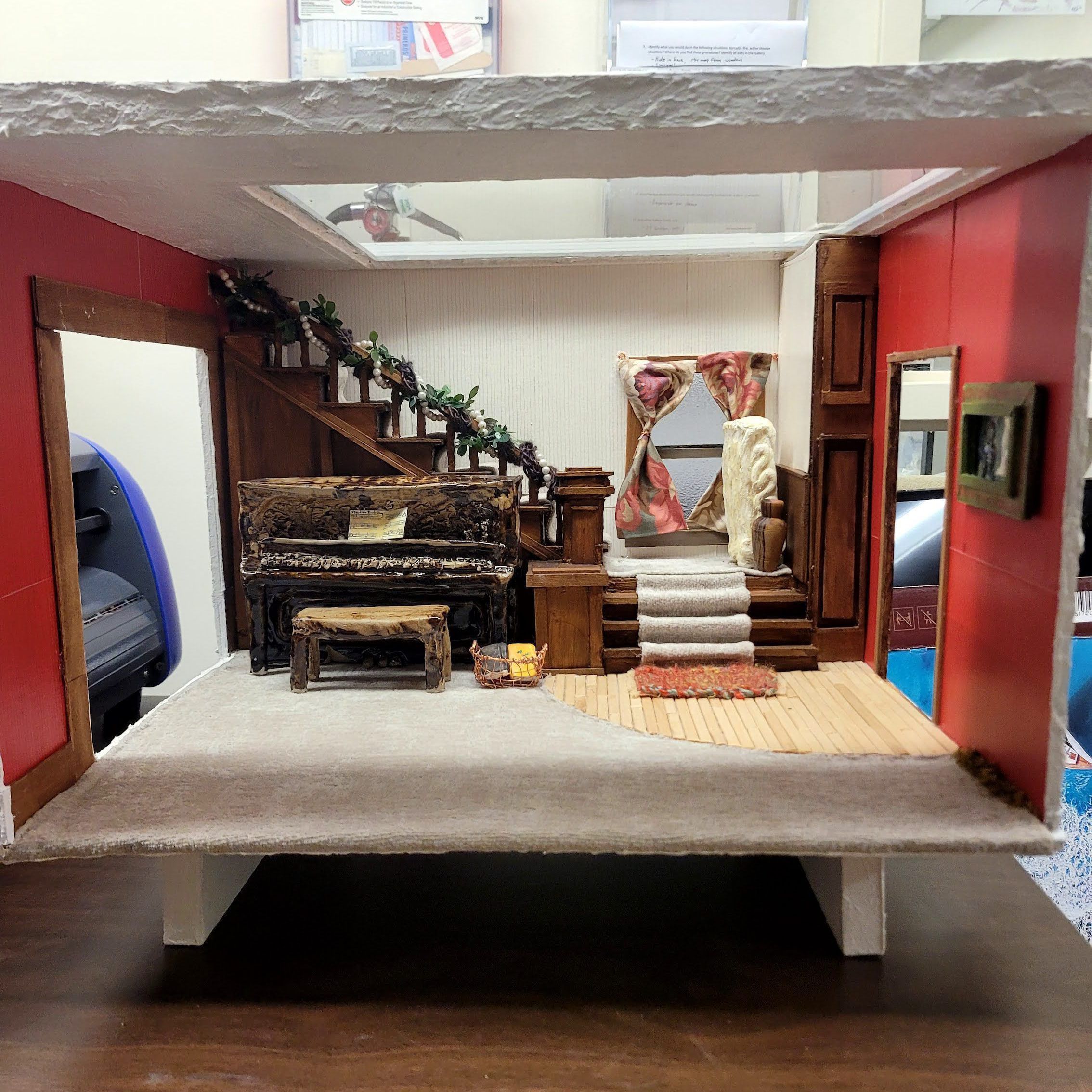 3D model of a living room, multimedia, red, brown, grey, piano, stairs, houseCollection