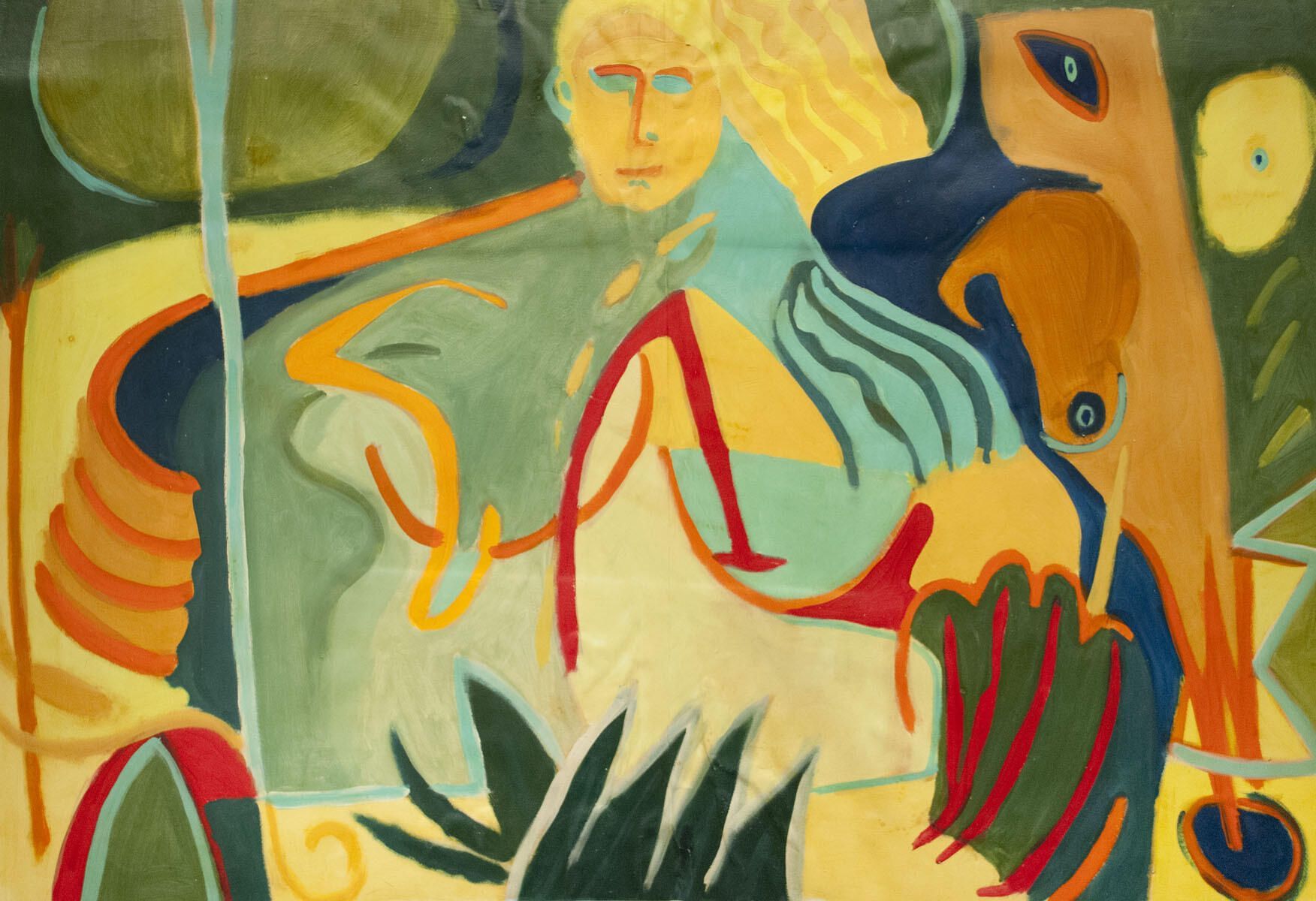 Small tears, abrasions in borders. Extensive buckling and creasing of paper throughout image. Female figure, nature setting. San Miguel series.Dimensions