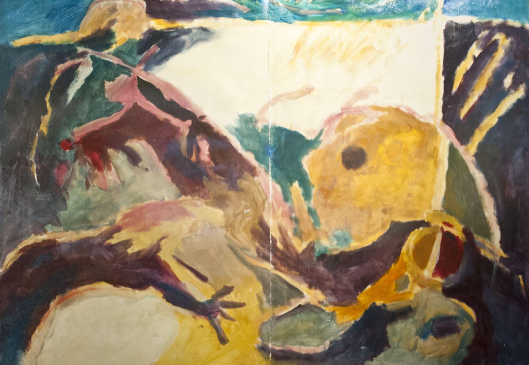 Two sheets adhered together to form a larger image area. Multiple tears in upper-left border. Pinholes in each corner, paint transfers in center of image. Figural.Location