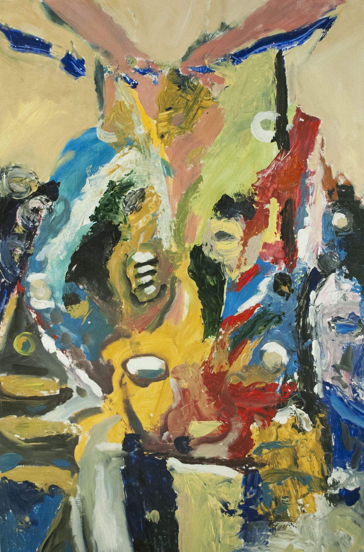 Multiple pinholes in top corners. Tears in left, bottom borders. Bottom tear going into image. Image torn, repaired by artist with scrap paper and acrylic medium. Two figures.Location