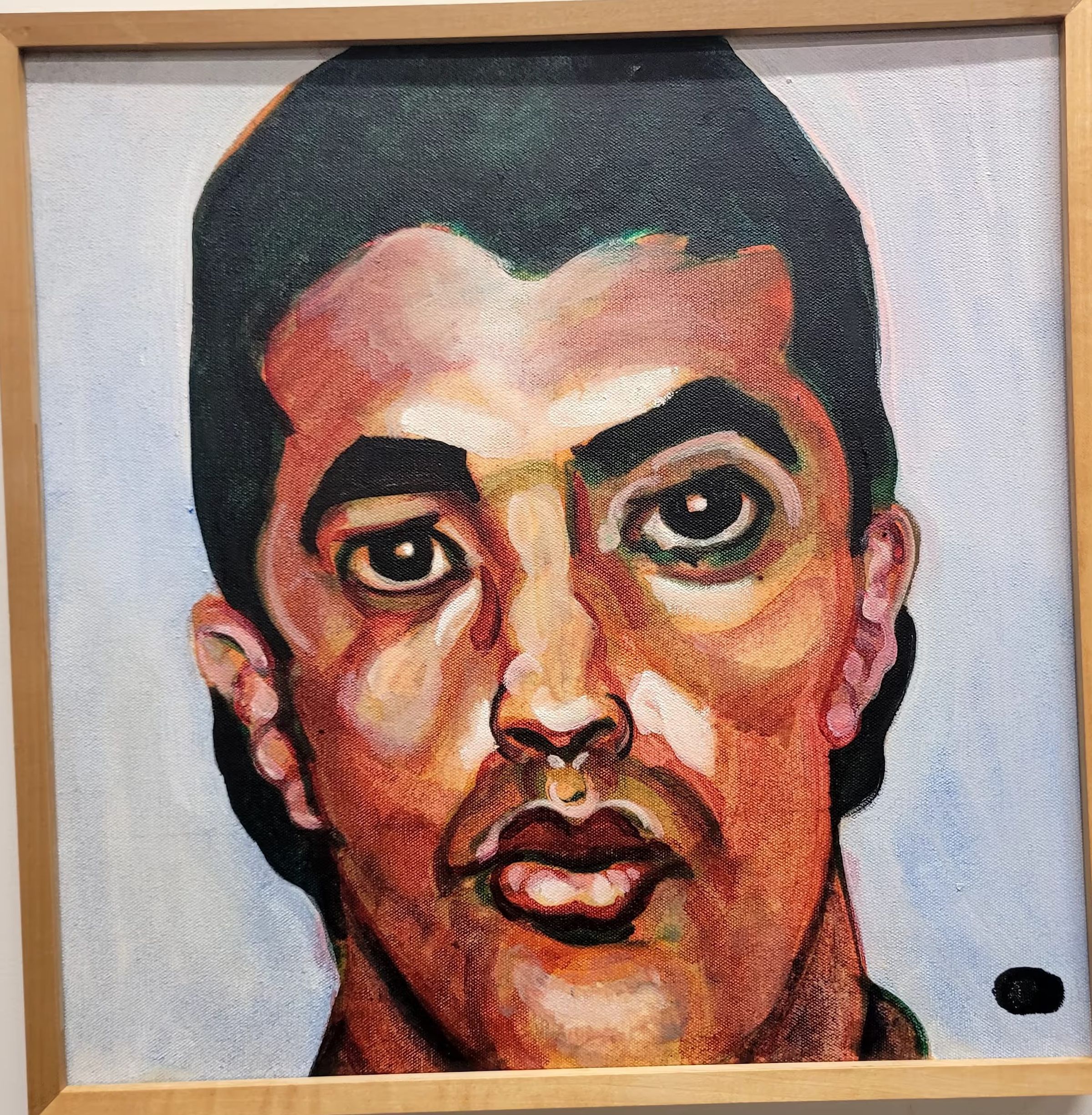 Just head, no shoulders. Short black hair, clean shaven, lots of reds used in the face. Black fingerprint in bottom right corner. Baby blue background. brown, red, 9/11, white, black, human, manType of Painting