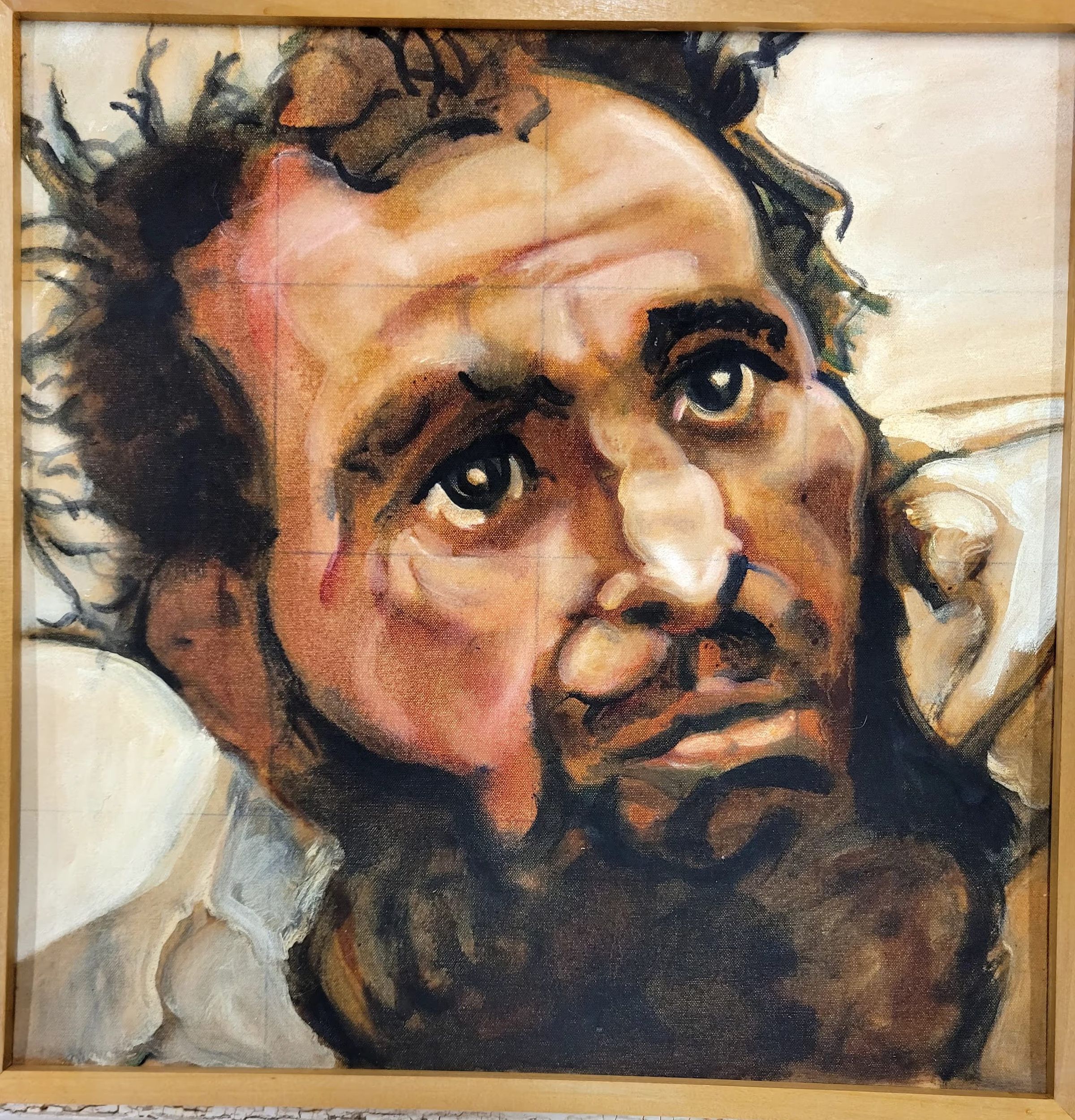 A man leaning left with crazy hair all over the place. Grid pattern is visible, 9/11, brown, grey, black, white, red, human, man, beardType of Painting