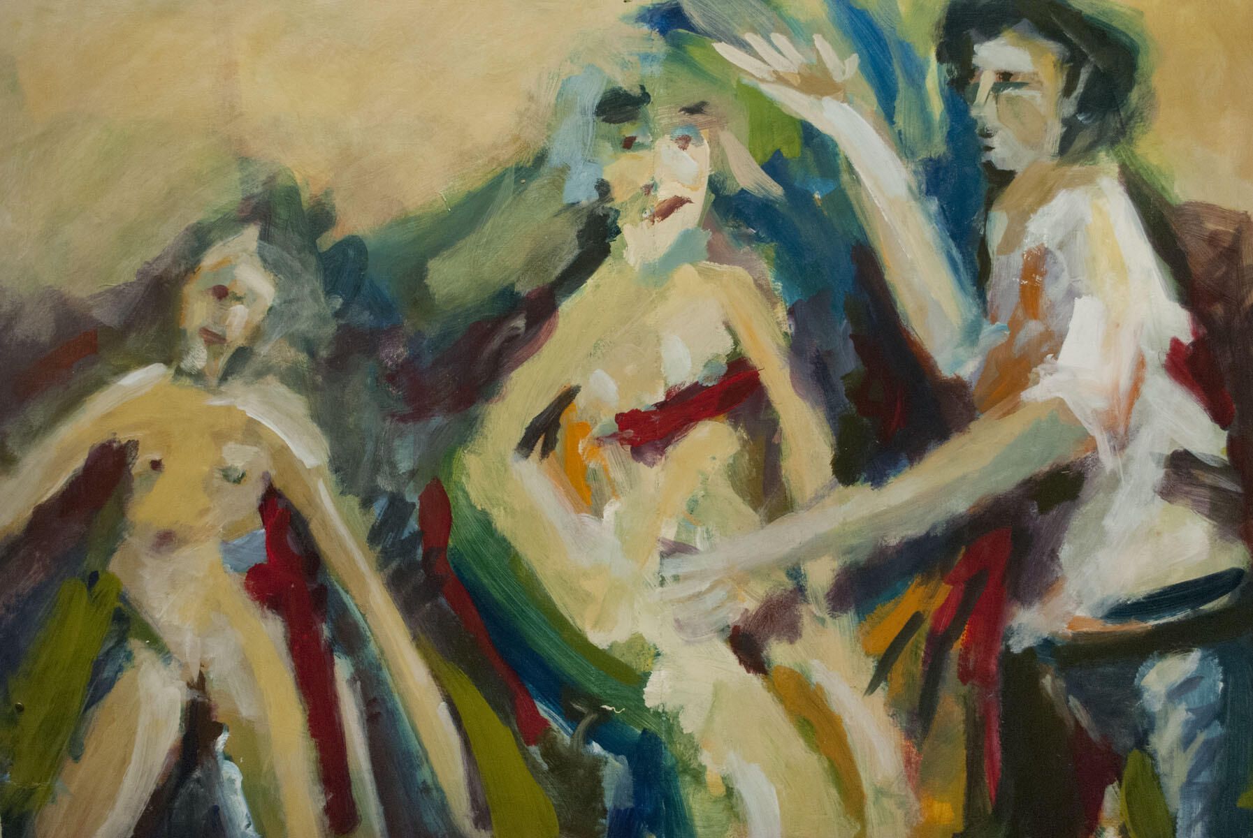 Bleed image, multiple pinholes in corners. Tear in top edge, tear at bottom left edge. Points of paint transfer throughout image. Two sheets adhered together to form larger image area. Three figures.Dimensions